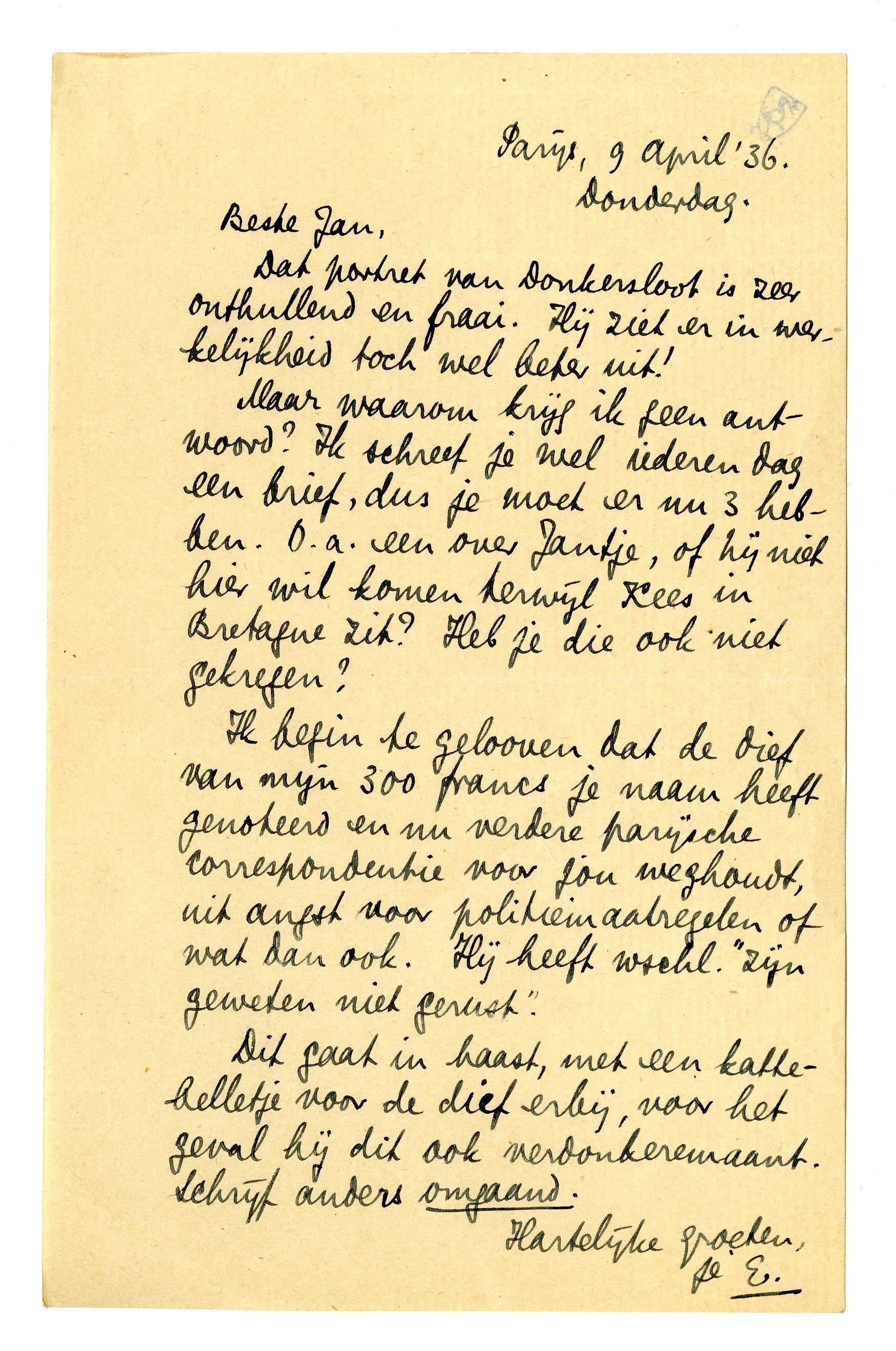 Ik begin te gelooven dat de dief van mijn 300 francs je naam heeft genoteerd en nu verdere parijsche correspondentie voor jou weghoudt, uit angst voor politiemaatregelen of wat dan ook. Hij heeft wschl. ‘zijn geweten niet gerust’.