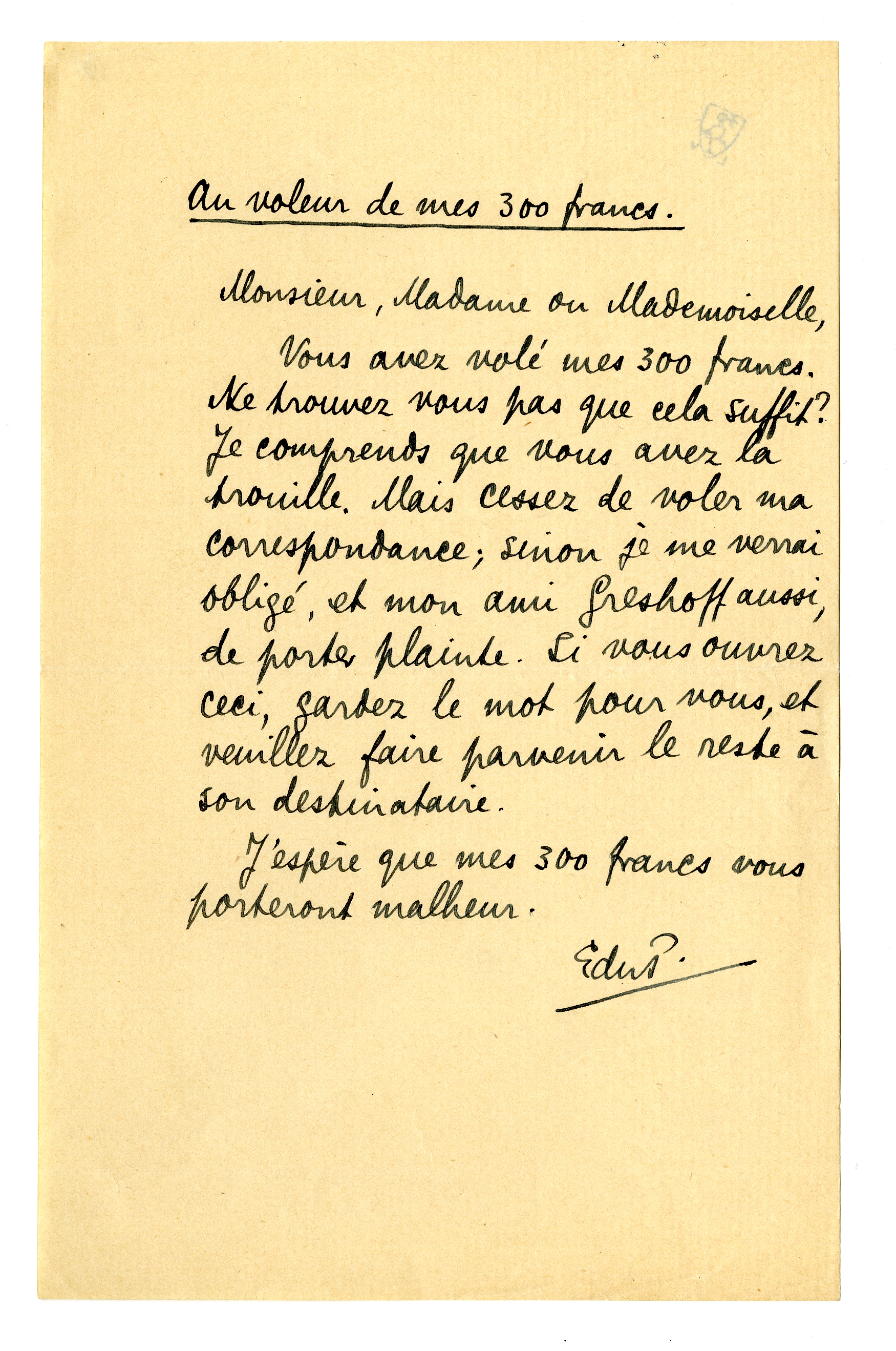 Vous avez volé mes 300 francs. Ne trouvez vous pas que cela suffit? Je comprends que vous avez la trouille. Mais cessez de voler ma correspondance; sinon je me verrai obligé, et mon ami Greshoff aussi, de porter plainte. Si vous ouvrez ceci, gardez le mot pour vous, et veuillez faire parvenir le reste à son destinataire.