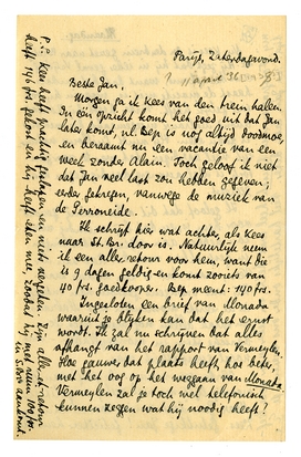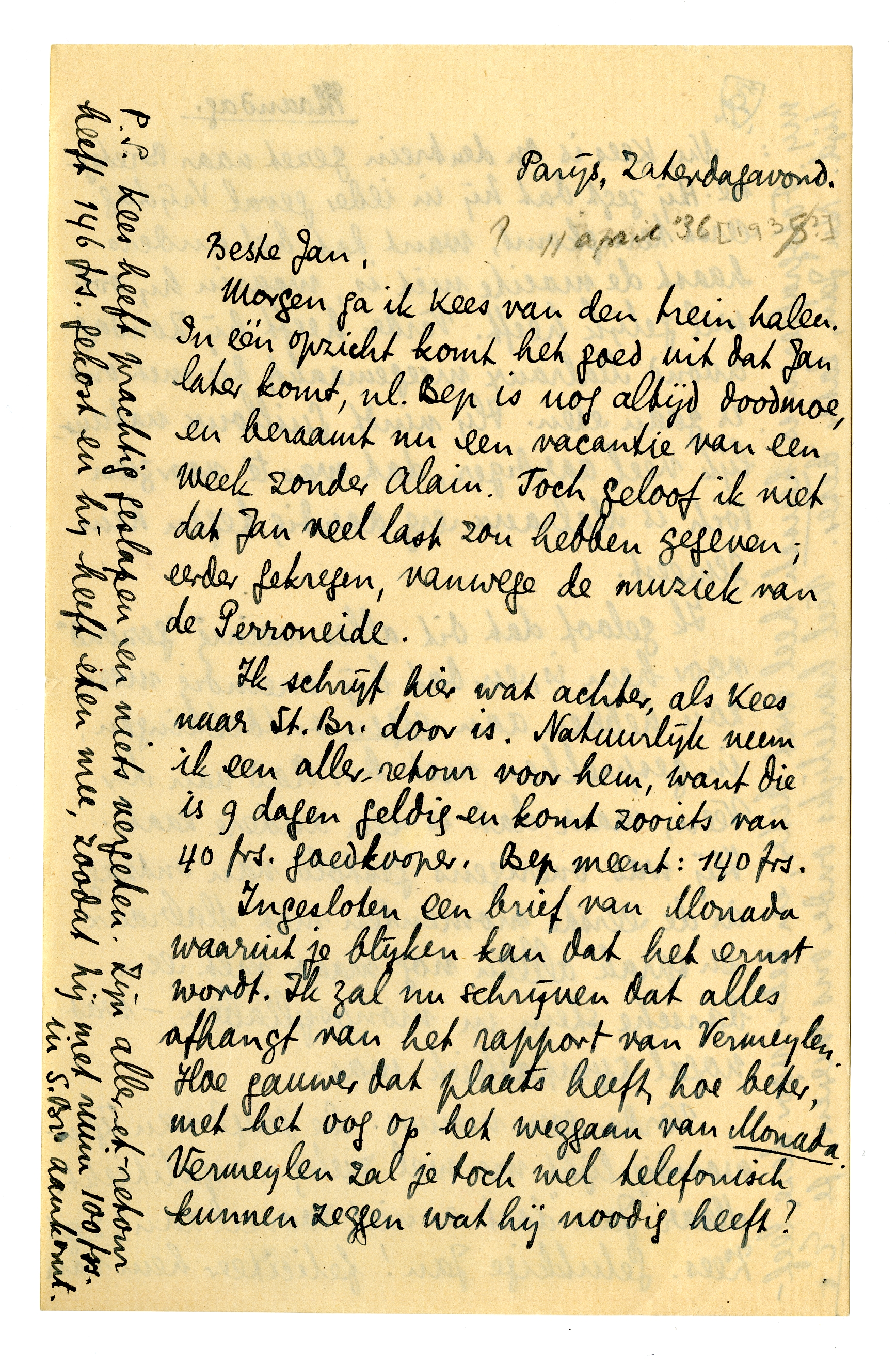 P.S. Kees heeft prachtig geslapen en niets vergeten. Zijn aller-et-retour heeft 146 frs. gekost en hij heeft eten mee, zoodat hij met ruim 100 frs. in S. Br. aankomt.