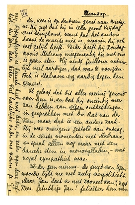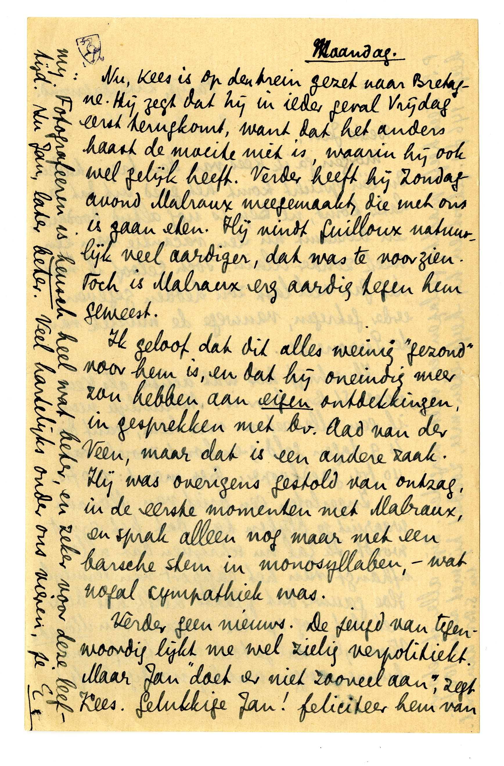 Nu, Kees is op den trein gezet naar Bretagne. Hij zegt dat hij in ieder geval Vrijdag eerst terugkomt, want dat het anders haast de moeite niet is, waarin hij ook wel gelijk heeft. Verder heeft hij Zondagavond Malraux meegemaakt, die met ons is gaan eten. Hij vindt Guilloux natuurlijk veel aardiger, dat was te voorzien. Toch is Malraux erg aardig tegen hem geweest.