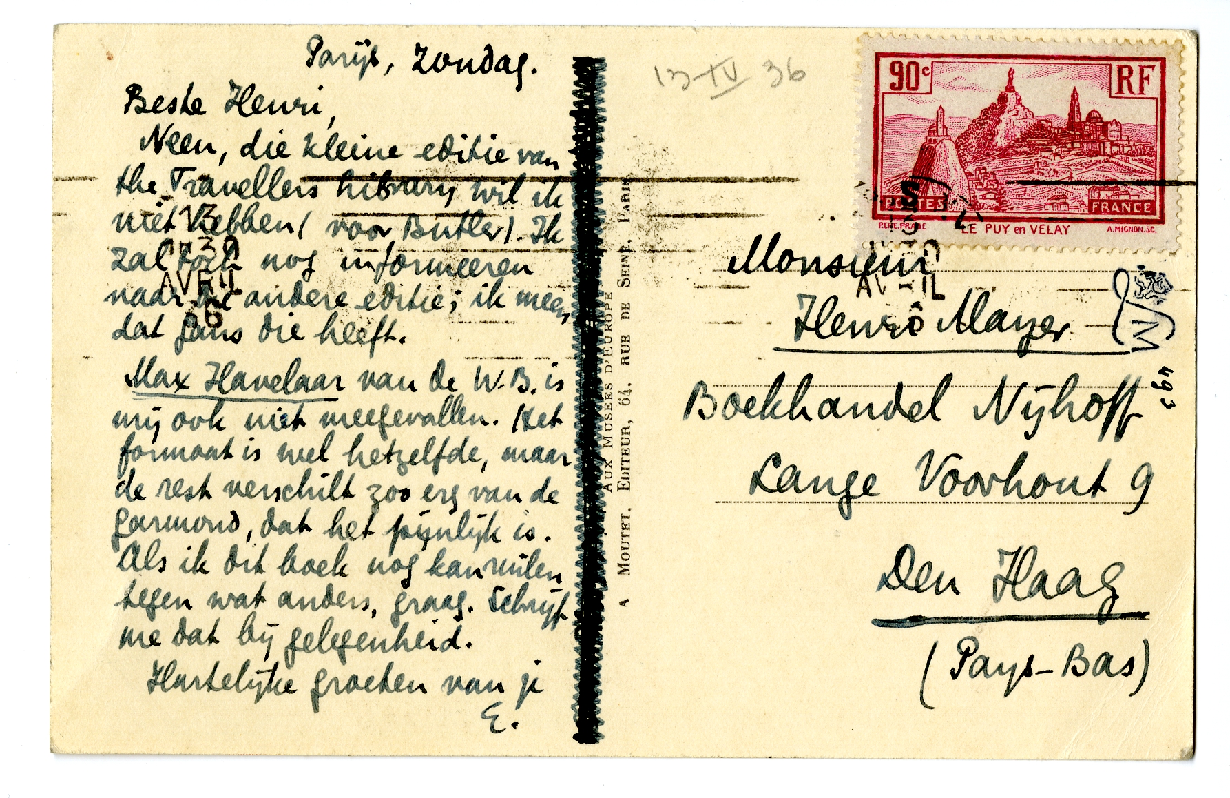 Max Havelaar van de W.B. is mij ook niet meegevallen. Het formaat is wel hetzelfde, maar de rest verschilt zoo erg van de Garmond, dat het pijnlijk is. Als ik dit boek nog kan ruilen tegen wat anders, graag. Schrijf me dat bij gelegenheid.