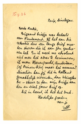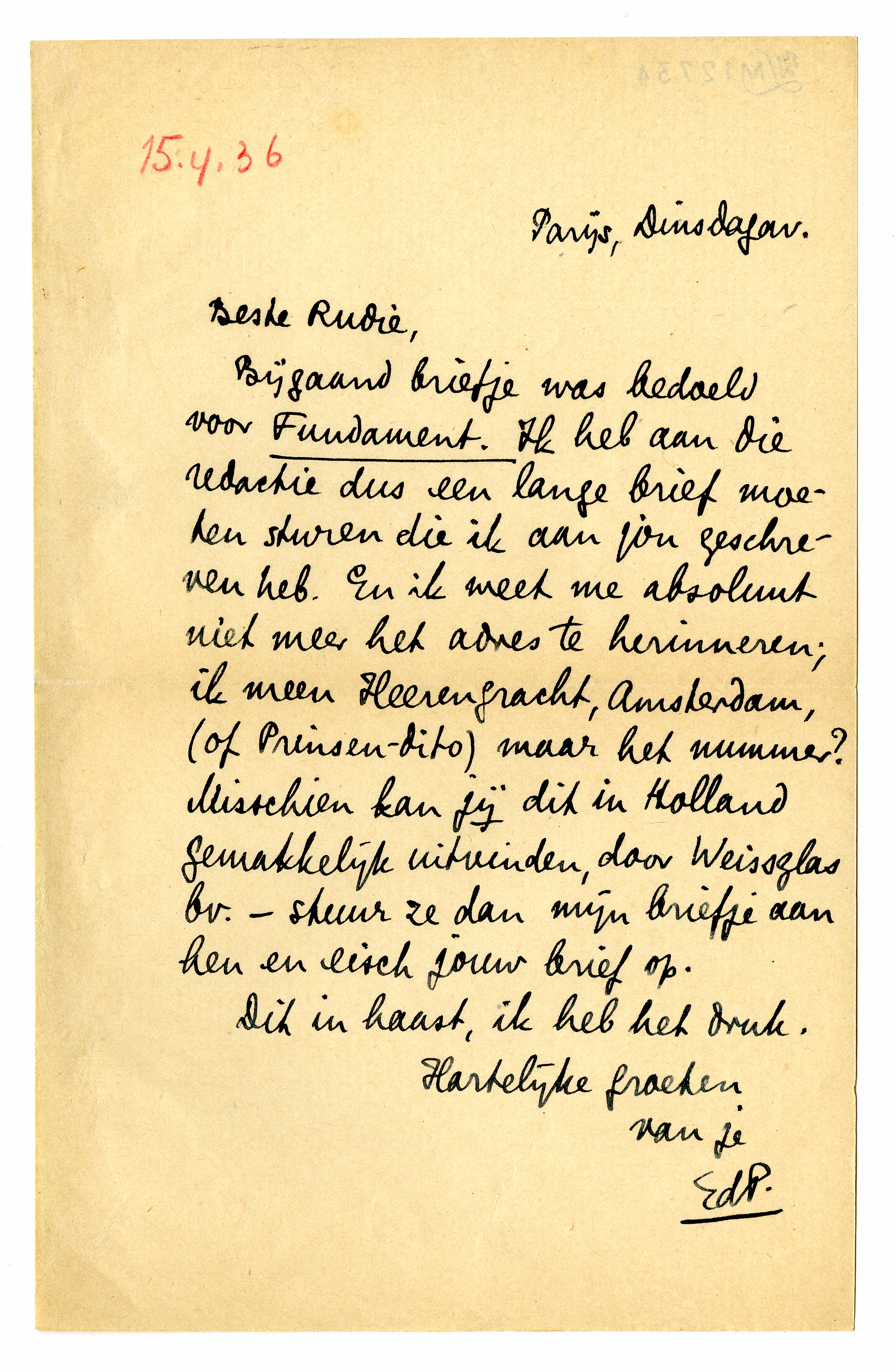 Bijgaand briefje was bedoeld voor Fundament.4152 Ik heb aan die redactie dus een lange brief moeten sturen die ik aan jou geschreven heb. En ik weet me absoluut niet meer het adres te herinneren; ik meen Heerengracht, Amsterdam, (of Prinsen-dito) maar het nummer? Misschien kan jij dit in Holland gemakkelijk uitvinden, door Weissglas bv. - stuur ze dan mijn briefje aan hen en eisch jouw brief op.