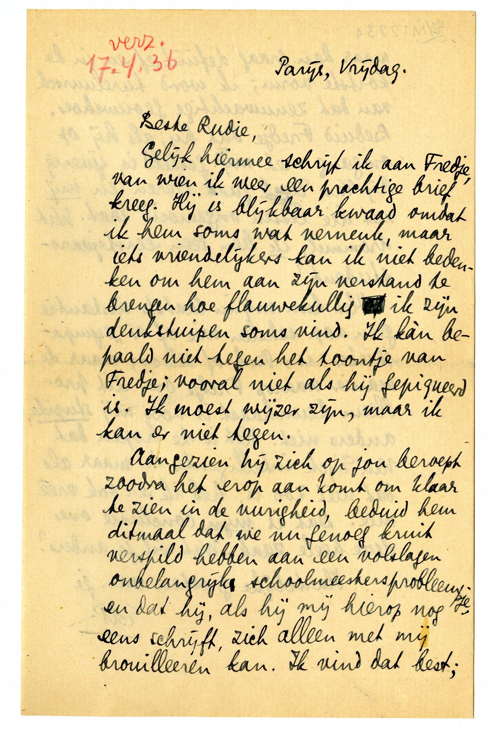 Gelijk hiermee schrijf ik aan Fredje, van wien ik weer een prachtige brief kreeg. Hij is blijkbaar kwaad omdat ik hem soms wat verneuk, maar iets vriendelijkers kan ik niet bedenken om hem aan zijn verstand te brengen hoe flauwekullig ik zijn denkstuipen soms vind. Ik kan bepaald niet tegen het toontje van Fredje; vooral niet als hij gepiqueerd is. Ik moest wijzer zijn, maar ik kan er niet tegen.
