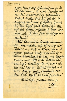 Het kan mij in laatste instantie geen aap schelen wie of er ‘sympathieker’ is: Perk of Kloos; maar de manier waarop Fredje over dit probleem beunhaast is voor mij stupide, anders niet. Het is te hopen dat Van Eyck intelligenter is, maar als dat niet zoo is, heb ik er ook vreê mee. Dat is mijn conclusie over deze heele zaak. Wat wil je anders?