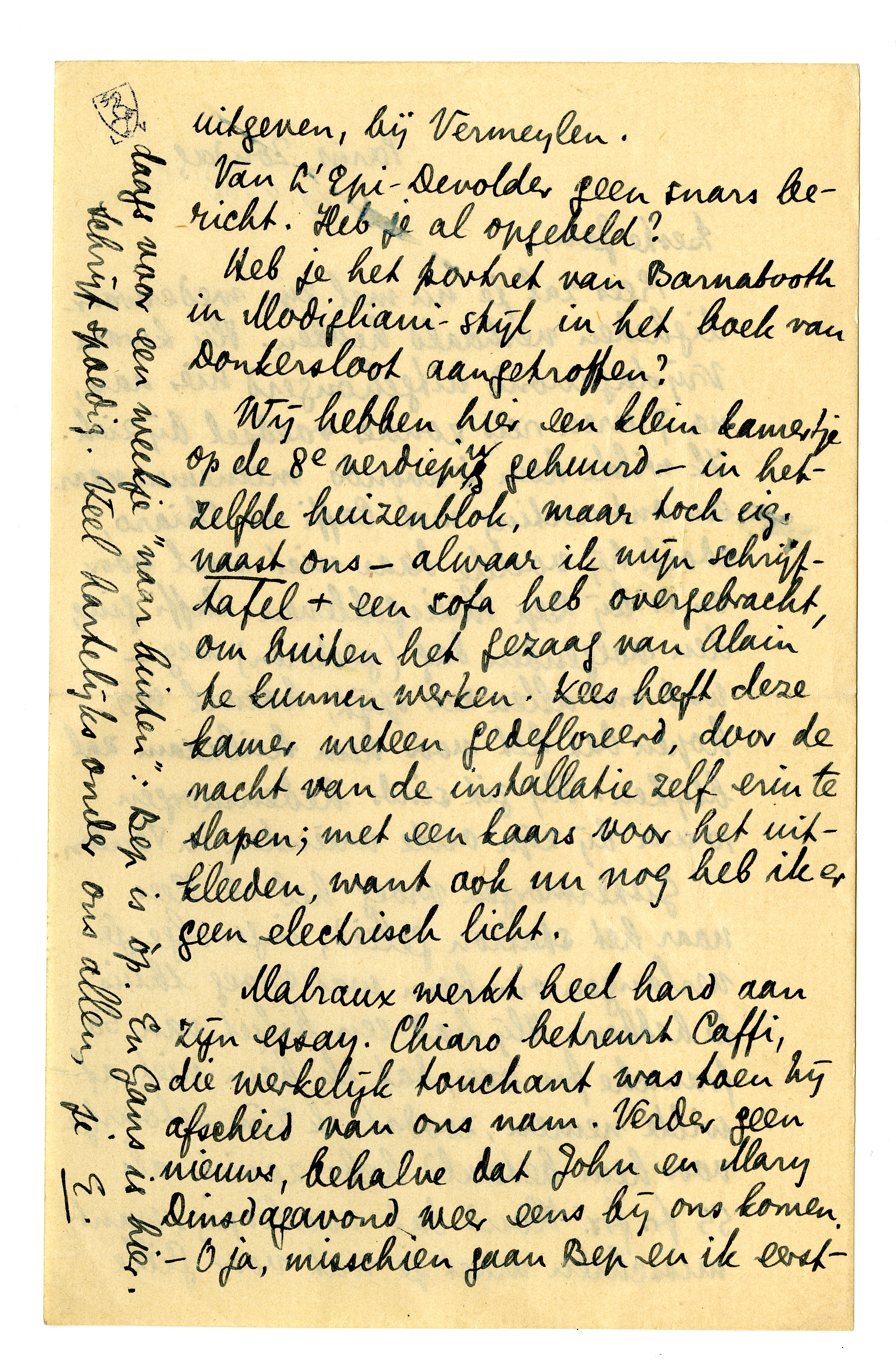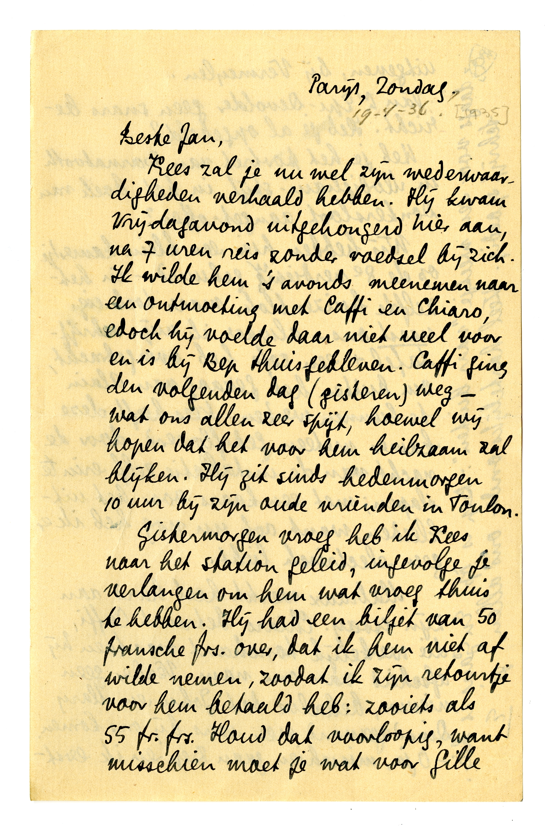 Kees zal je nu wel zijn wederwaardigheden verhaald hebben. Hij kwam Vrijdagavond uitgehongerd hier aan, na 7 uren reis zonder voedsel bij zich. Ik wilde hem 's avonds meenemen naar een ontmoeting met Caffi en Chiaro, edoch hij voelde daar niet veel voor en is bij Bep thuisgebleven. Caffi ging den volgenden dag (gisteren) weg - wat ons allen zeer spijt, hoewel wij hopen dat het voor hem heilzaam zal blijken. Hij zit sinds hedenmorgen 10 uur bij zijn oude vrienden in Toulon.