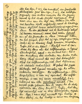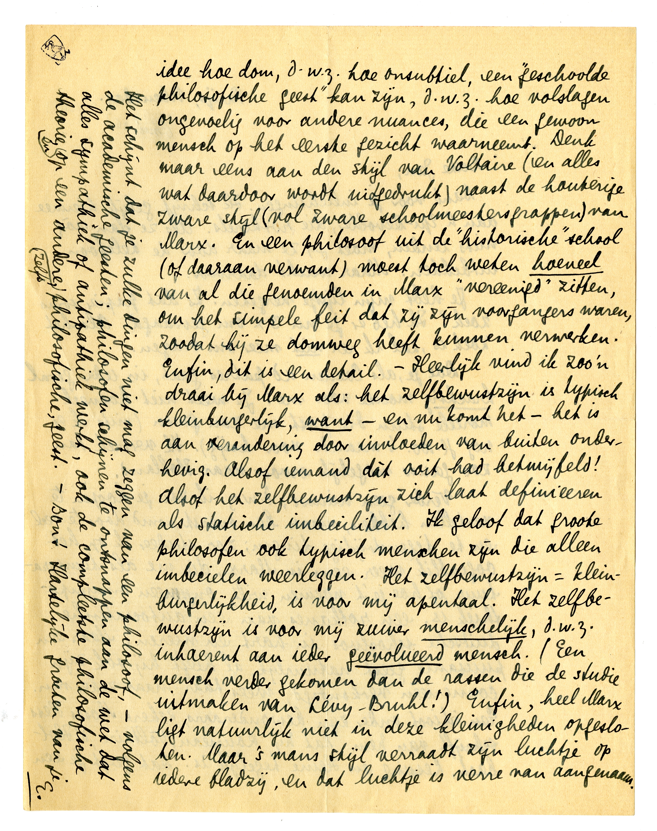 Verder geen nieuws; d.w.z. ik zou je hoopen te vertellen hebben, maar ben overstroomd door te veel en te tègenstrijdige dingen; zoo studeer ik op het oogenblik weer eens in Marx, die me als temperatuur, of hoe je 't noemen wilt, ongemeen onsympathiek is, een rot-kaes van een autocratische duitsche schoolvos in hart en nieren. Maar een puissante geest natuurlijk, al heeft hij ook zijn connerieën verkondigd, wees daar maar zeker van. Een idioot onder zijn bewonderaars, zekere Moses Hess schrijft van hem dat hij Rousseau, Voltaire, d'Holbach, Lessing en Heine tegelijk is.4174 Dat geeft je een idee hoe dom, d.w.z. hoe onsubtiel, een ‘geschoolde philosofische geest’ kan zijn, d.w.z. hoe volslagen ongevoelig voor andere nuances, die een gewoon mensch op het eerste gezicht waarneemt. Denk maar eens aan den stijl van Voltaire (en alles wat daardoor wordt uitgedrukt) naast de houterige zware stijl (vol zware schoolmeestersgrappen) van Marx. En een philosoof uit de ‘historische’ school (of daaraan verwant) moest toch weten hoeveel van al die genoemden in Marx ‘vereenigd’ zitten, om het simpele feit dat zij zijn voorgangers waren, zoodat hij ze domweg heeft kunnen verwerken. Enfin, dit is een detail. - Heerlijk vind ik zoo'n draai bij Marx als: het zelfbewustzijn is typisch kleinburgerlijk, want - en nu komt het - het is aan verandering door invloeden van buiten onderhevig.4175 Alsof iemand dàt ooit had betwijfeld! Alsof het zelfbewustzijn zich laat definieeren als statische imbeciliteit. Ik geloof dat groote philosofen ook typisch menschen zijn die alleen imbecielen weerleggen. Het zelfbewustzijn = kleinburgerlijkheid, is voor mij apentaal. Het zelfbewustzijn is voor mij zuiver menschelijk, d.w.z. inhaerent aan ieder geëvolueerd mensch. (Een mensch verder gekomen dan de rassen die de studie uitmaken van Lévy-Bruhl!) Enfin, heel Marx ligt natuurlijk niet in deze kleinigheden opgesloten. Maar 'smans stijl verraadt zijn luchtje op iedere bladzij, en dat luchtje is verre van aangenaam. Het schijnt dat je zulke dingen niet mag zeggen van een philosoof, - volgens de academische geesten; philosofen schijnen te ontsnappen aan de wet dat alles sympathiek of antipathiek werkt, ook de compleetste philosofische theorie, en op een andere, zelfs philosofische, geest.-4176Bon! Hartelijke groeten van je