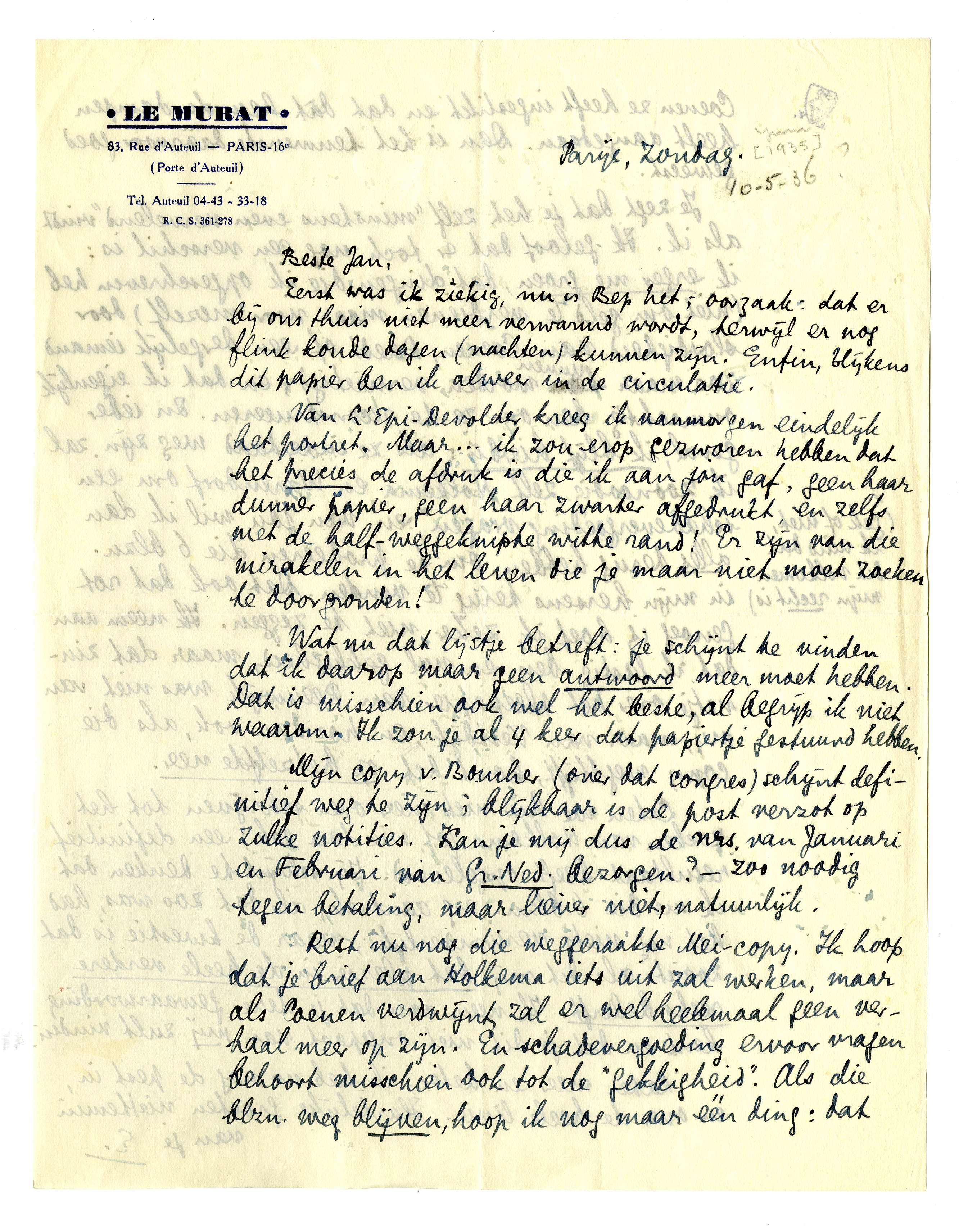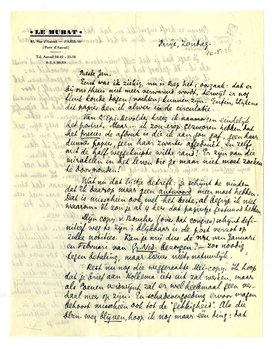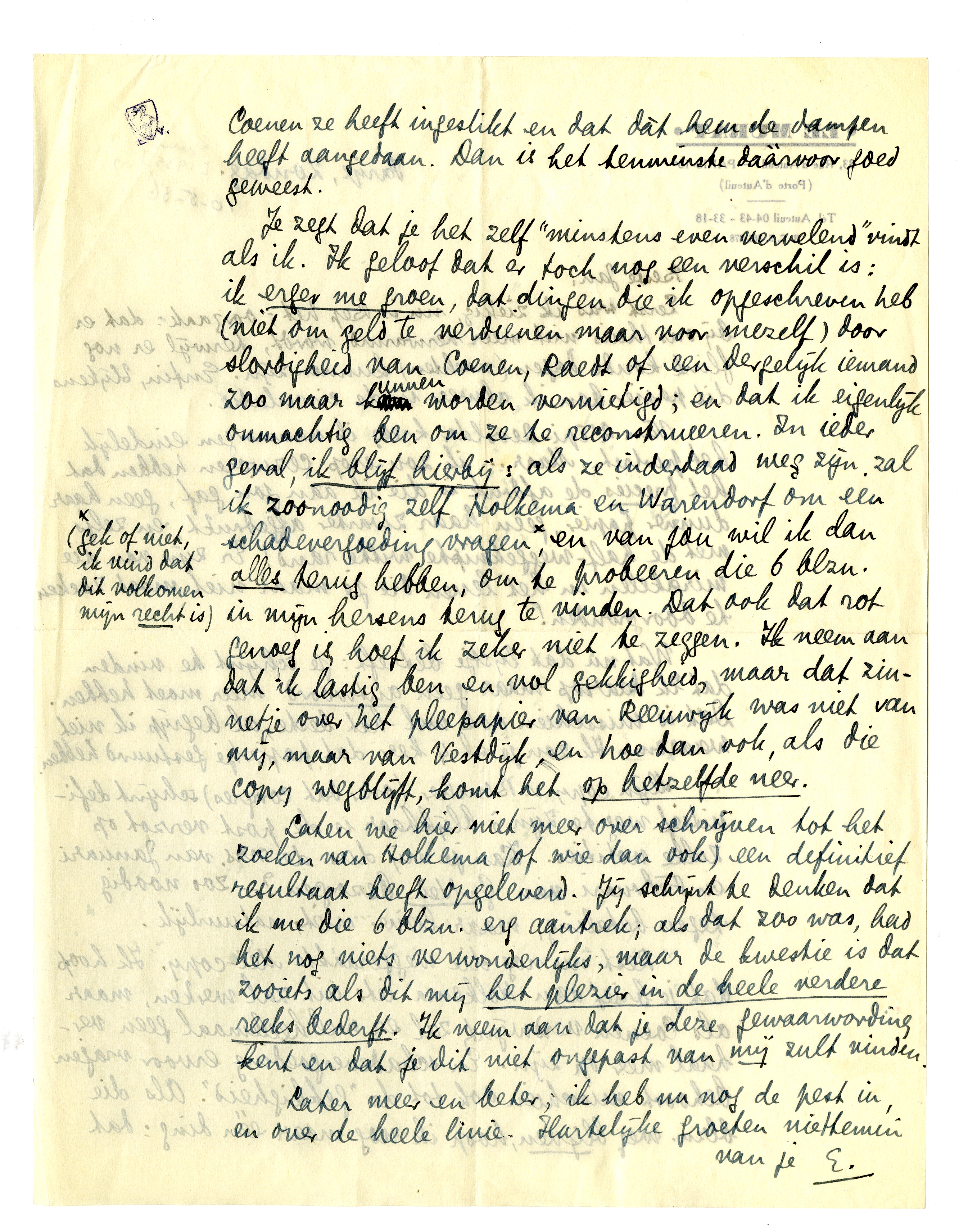 Je zegt dat je het zelf ‘minstens even vervelend’ vindt als ik. Ik geloof dat er toch nog een verschil is: ik erger me groen, dat dingen die ik opgeschreven heb (niet om geld te verdienen maar voor mezelf) door slordigheid van Coenen, Raedt of een dergelijk iemand zoo maar kunnen worden vernietigd; en dat ik eigenlijk onmachtig ben om ze te reconstrueeren. In ieder geval, ik blijf hierbij: als ze inderdaad weg zijn, zal ik zoonoodig zelf Holkema en Warendorf om een schadevergoeding vragen*, en van jou wil ik dan alles terug hebben, om te probeeren die 6 blzn. in mijn hersens terug te vinden. Dat ook dat rot genoeg is, hoef ik zeker niet te zeggen. Ik neem aan dat ik lastig ben en vol gekkigheid, maar dat zinnetje over het pleepapier van Reeuwijk was niet van mij, maar van Vestdijk, en hoe dan ook, als die copy wegblijft, komt het op hetzelfde neer.