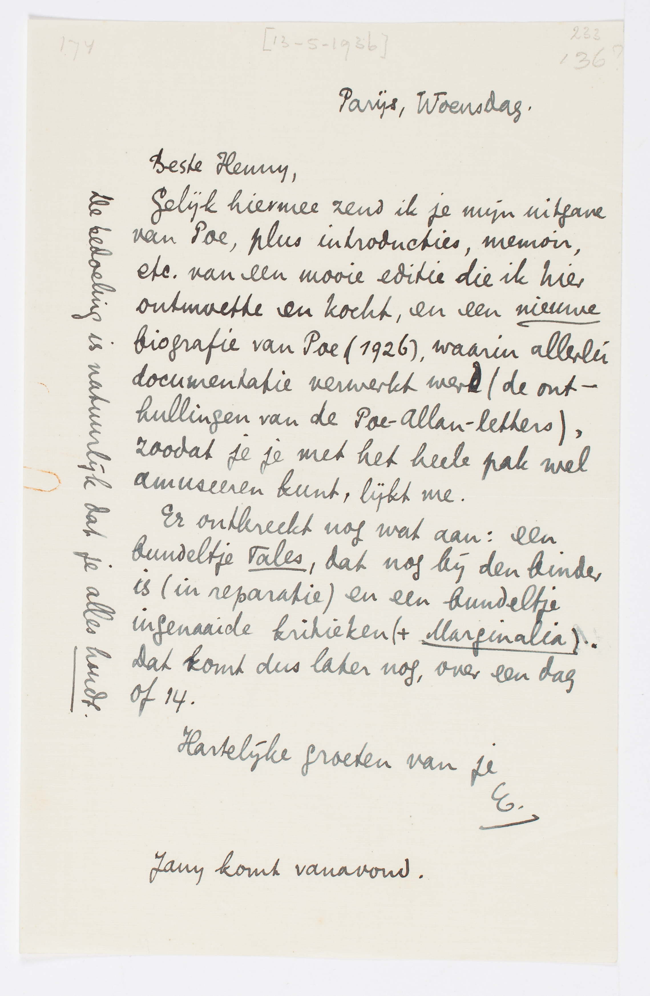 Gelijk hiermee zend ik je mijn uitgave van Poe, plus introducties, memoir, etc. van een mooie editie die ik hier ontmoette en kocht, en een nieuwe biografie van Poe (1926),4189 waarin allerlei documentatie verwerkt werd (de onthullingen van de Poe-Allan-letters), zoodat je je met het heele pak wel amuseeren kunt, lijkt me.