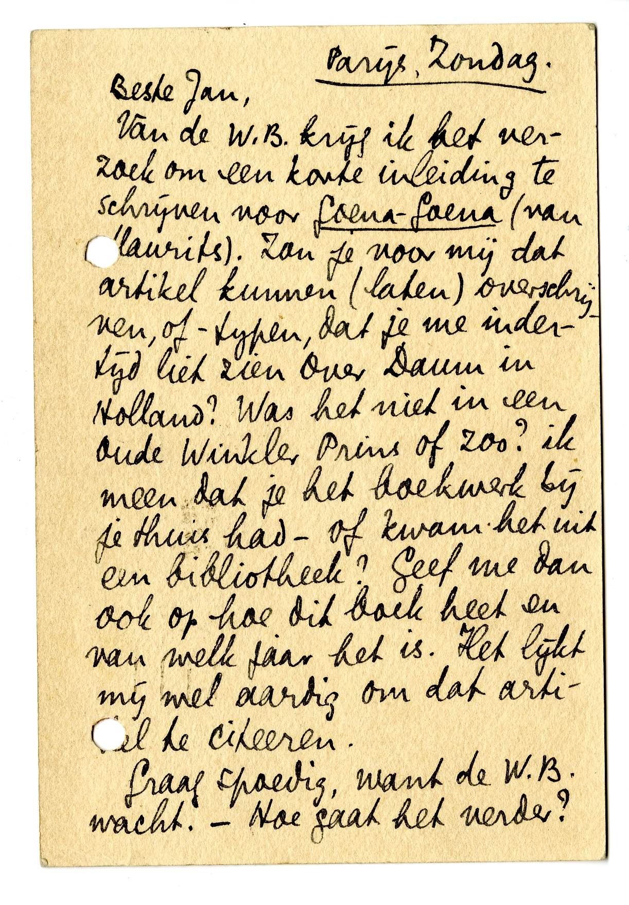 Van de W.B. krijg ik het verzoek om een korte inleiding te schrijven voor Goena-Goena (van Maurits). Zou je voor mij dat artikel kunnen (laten) overschrijven, of -typen, dat je me indertijd liet zien over Daum in Holland? Was het niet in een oude Winkler Prins of zoo? ik meen dat je het boekwerk bij je thuis had - of kwam het uit een bibliotheek? Geef me dan ook op hoe dit boek heet en van welk jaar het is. Het lijkt mij wel aardig om dat artikel te citeeren.