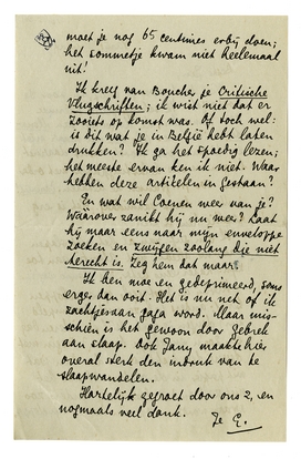 Hierbij de postzegels op enveloppen terug; anders (als ze niet gestempeld zijn) deugen ze niet. Wil je iederen dag één zoon enveloppe bussen? Begin met degene die dicht is, en doe dan wat wit papier in de andere. Ik doe het niet zelf, omdat deze brief anders zoo zwaar wordt. - Op één van de enveloppen moet je nog 65 centimes erbij doen; het sommetje kwam niet heelemaal uit!