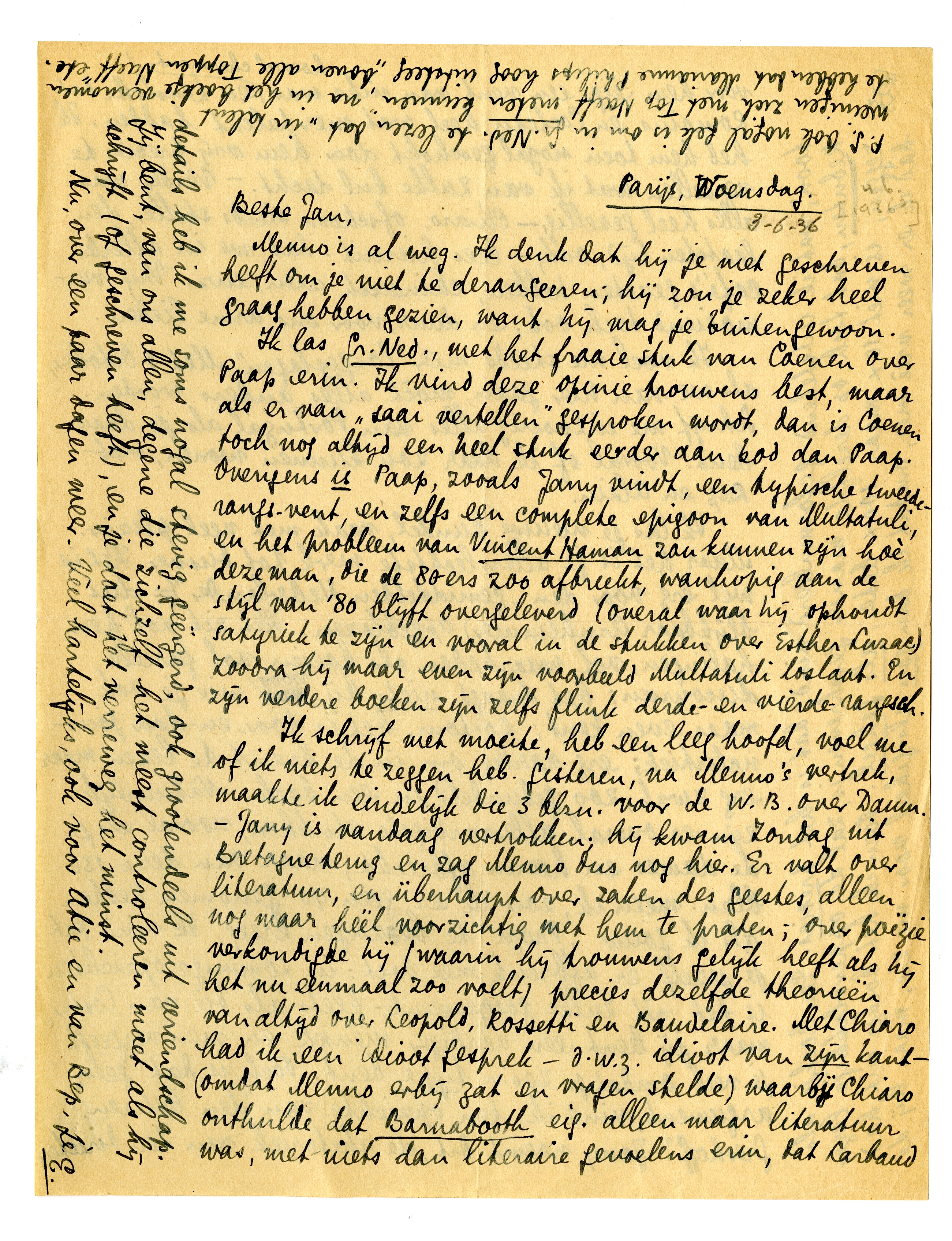 Ik schrijf met moeite, heb een leeg hoofd, voel me of ik niets te zeggen heb. Gisteren, na Menno's vertrek, maakte ik eindelijk de 3 blzn. voor de W.B. over Daum. - Jany is vandaag vertrokken; hij kwam Zondag uit Bretagne terug en zag Menno dus nog hier. Er valt over literatuur, en überhaupt over zaken des geestes, alleen nog maar héél voorzichtig met hem te praten; over poëzie verkondigde hij (waarin hij trouwens gelijk heeft als hij het nu eenmaal zoo voelt) precies dezelfde theorieën van altijd over Leopold, Rossetti en Baudelaire. Met Chiaro had ik een idioot gesprek - d.w.z. idioot van zijn kant - (omdat Menno erbij zat en vragen stelde) waarbij Chiaro onthulde dat Barnabooth eig. alleen maar literatuur was, met niets dan literaire gevoelens erin, dat Larbaud voor hem eig. een vent van niks was, hoewel charmant, en tenslotte dat Romains en Cocteau heel wat meer talent hadden. Ik heb hem toen nogal geschokt door hem vrij precies te vertellen wat ik van zulke kul dacht. - Verder was alles heel gezellig, - Chiaro, ofschoon steeds stiller, den laatsten tijd, ook, - lees hieruit: dat we in allerlei café's gezeten hebben, chineesch aten, enz. Vrij vermoeiend toch ook, en duur, voor ons arme lieden.