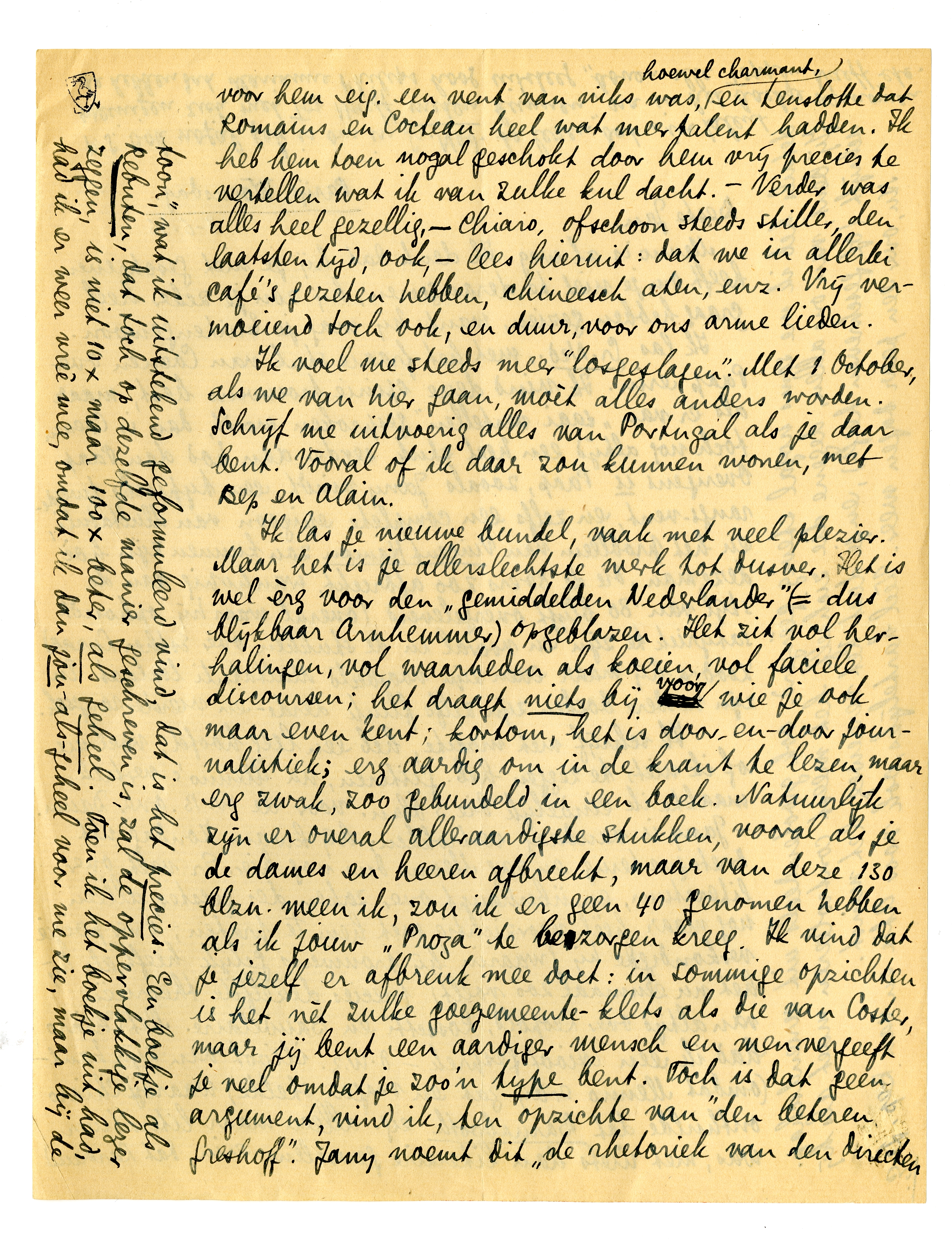 Ik las je nieuwe bundel,4205 vaak met veel plezier. Maar het is je allerslechtste werk tot dusver. Het is wel èrg voor den ‘gemiddelden Nederlander’ (= dus blijkbaar Arnhemmer4206) opgeblazen. Het zit vol herhalingen, vol waarheden als koeien, vol faciele discoursen; het draagt niets bij voor wie je ook maar even kent; kortom, het is door-en-door journalistiek; erg aardig om in de krant te lezen, maar erg zwak, zoo gebundeld in een boek. Natuurlijk zijn er overal alleraardigste stukken, vooral als je de dames en heeren afbreekt, maar van deze 130 blzn. meen ik, zou ik er geen 40 genomen hebben als ik jouw ‘Proza’ te bezorgen kreeg. Ik vind dat je jezelf er afbreuk mee doet; in sommige opzichten is het nèt zulke goegemeente-klets als die van Coster, maar jij bent een aardiger mensch en men vergeeft je veel omdat je zoo'n type bent. Toch is dat geen argument, vind ik, ten opzichte van ‘den beteren Greshoff’ Jany noemt dit ‘de rhetoriek van den directen toon’, wat ik uitstekend geformuleerd vind, dat is het precies. Een boekje als Rebuten,4207 dat toch op dezelfde manier geschreven is, zal de oppervlakkige lezer zeggen, is niet 10 × maar 100 × beter, als geheel. Toen ik het boekje uit had, had ik er weer vreê mee, omdat ik dan joy-als-geheel voor me zie, maar bij de details heb ik me soms nogal stevig geërgerd, ook grootendeels uit vriendschap. Jij bent, van ons allen, degene die zichzelf het meest controleeren moet als hij schrijft (of geschreven heeft), en je doet het verreweg het minst.