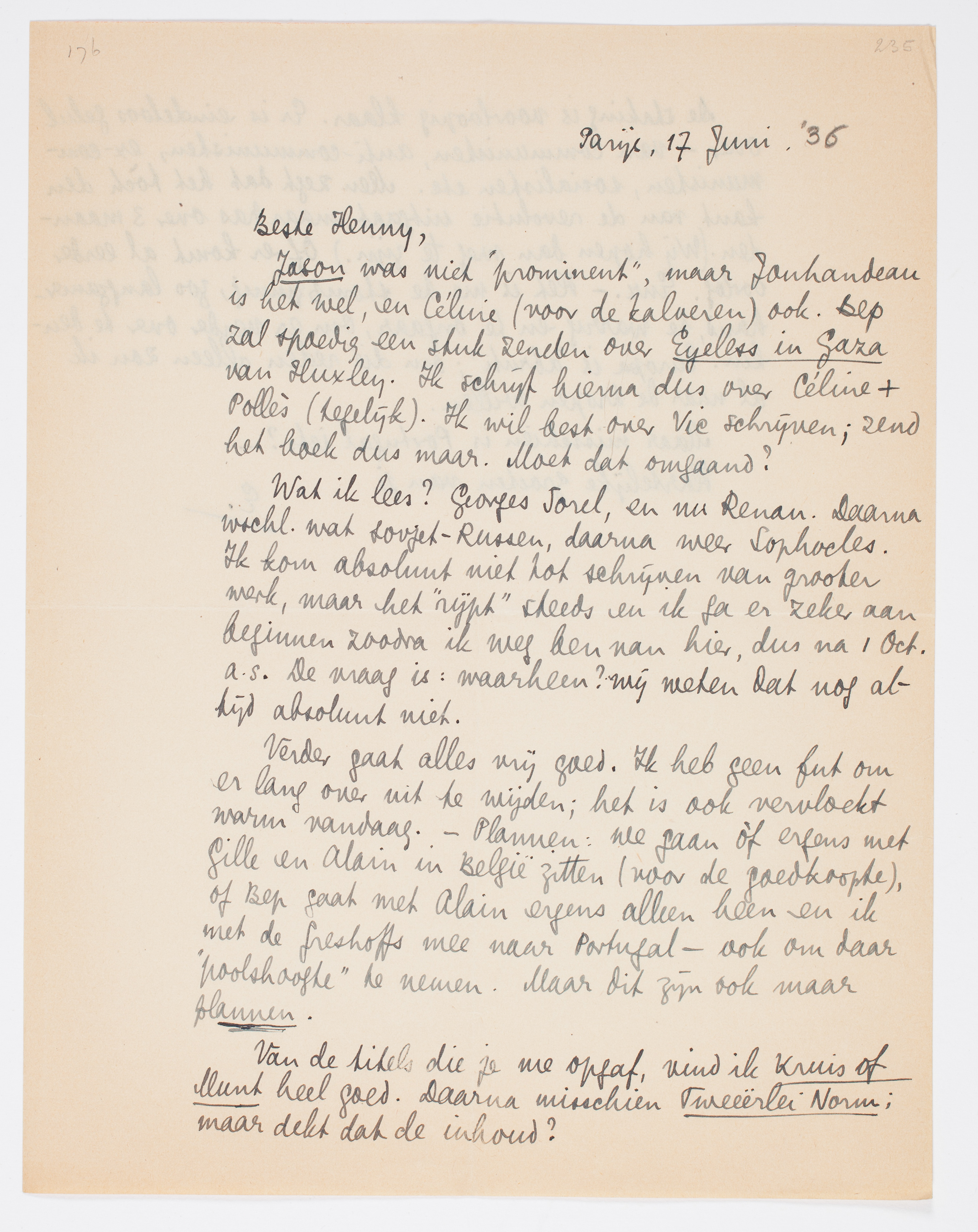 Jason was niet ‘prominent’, maar Jouhandeau is het wel, en Céline (voor de kalveren) ook. Bep zal spoedig een stuk zenden over Eyeless in Gaza van Huxley.4245 Ik schrijf hierna dus over Céline + Pollés (tegelijk). Ik wil best over Vic schrijven; zend het boek dus maar. Moet dat omgaand?