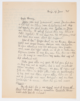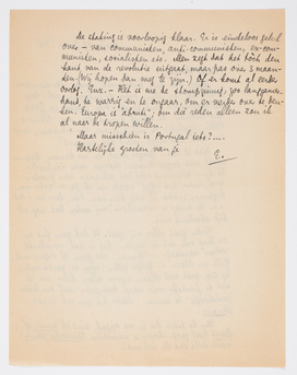 Wat ik lees? Georges Sorel, en nu Renan. Daarna wschl. wat sov-jet-Russen, daarna weer Sophocles. Ik kom absoluut niet tot schrijven van grooter werk, maar het ‘rijpt’ steeds en ik ga er zeker aan beginnen zoodra ik weg ben van hier, dus na 1 Oct. a.s. De vraag is: waarheen? Wij weten dat nog altijd absoluut niet.