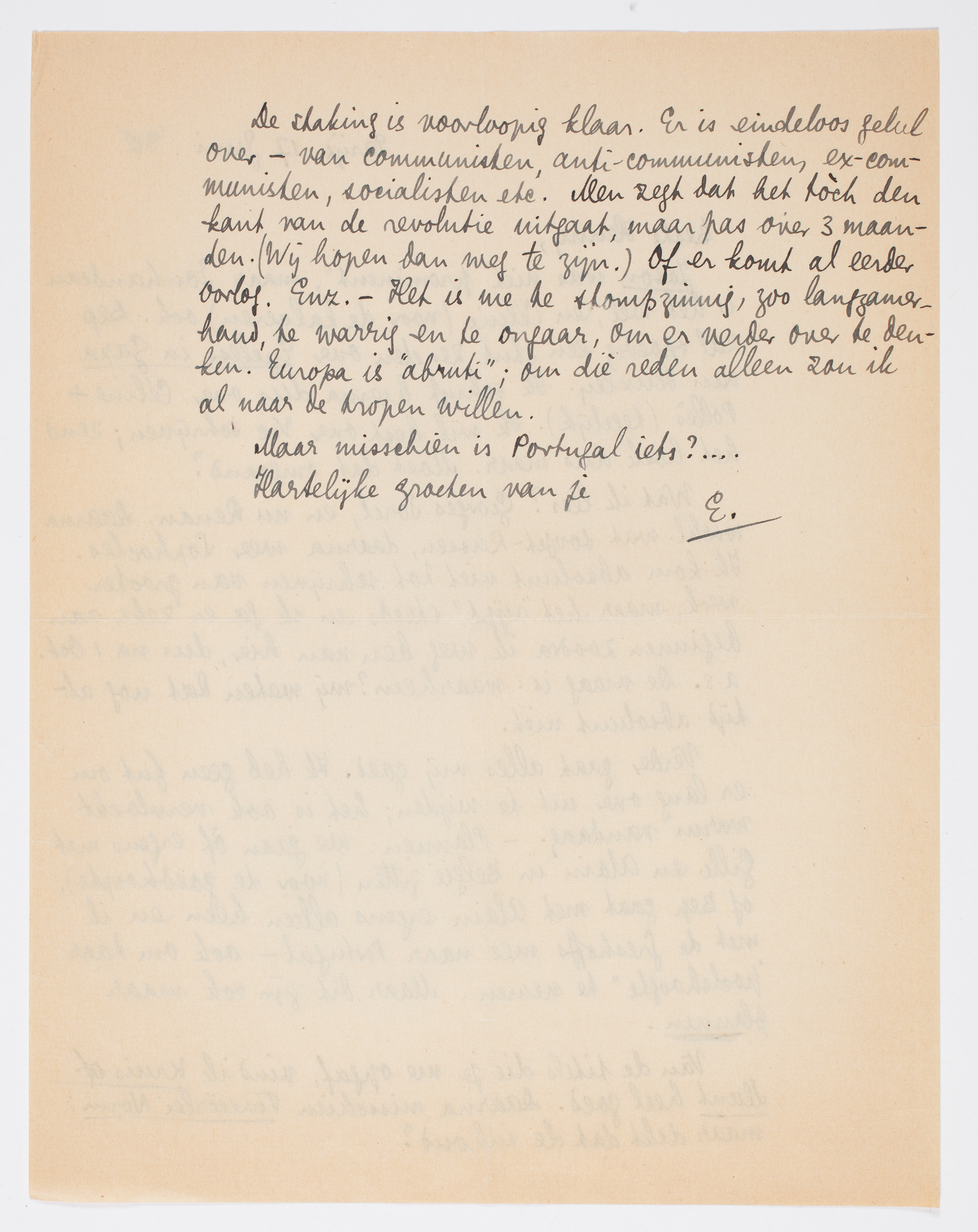 De staking is voorloopig klaar. Er is eindeloos gelul over - van communisten, anti-communisten, ex-communisten, socialisten etc. Men zegt dat het tòch den kant van de revolutie uitgaat, maar pas over 3 maanden. (Wij hopen dan weg te zijn.) Of er komt al eerder oorlog. Enz. - Het is me te stompzinnig, zoo langzamerhand, te warrig en te ongaar, om er verder over te denken. Europa is ‘abruti’; om diè reden alleen zou ik al naar de tropen willen.