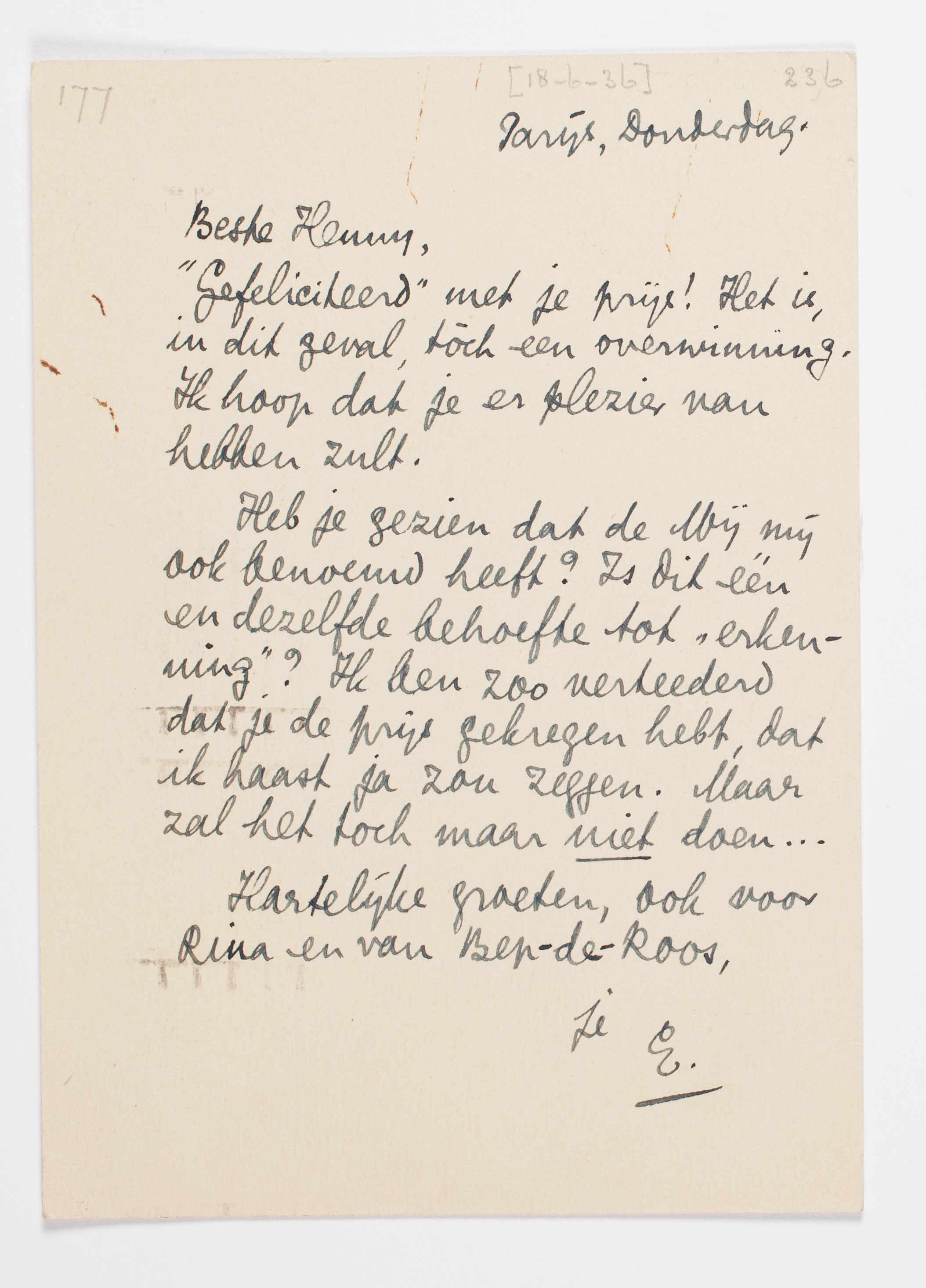Heb je gezien dat de Mij mij ook benoemd heeft? Is dit één en dezelfde behoefte tot ‘erkenning’? Ik ben zoo verteederd dat je de prijs gekregen hebt, dat ik haast ja zou zeggen. Maar zal het toch maar niet doen...