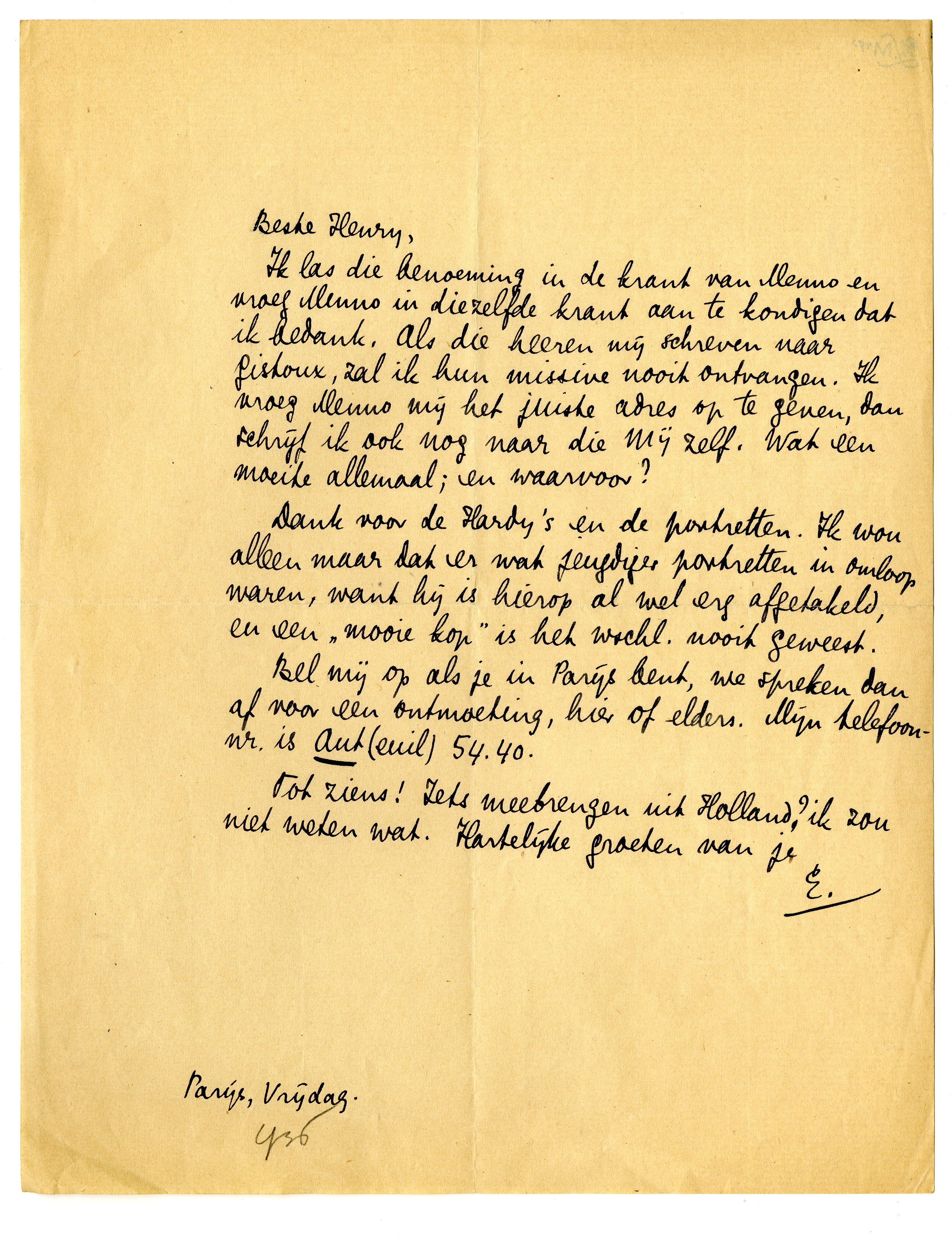 Bel mij op als je in Parijs bent, we spreken dan af voor een ontmoeting, hier of elders. Mijn telefoonnr. is Aut (euil) 54.40.