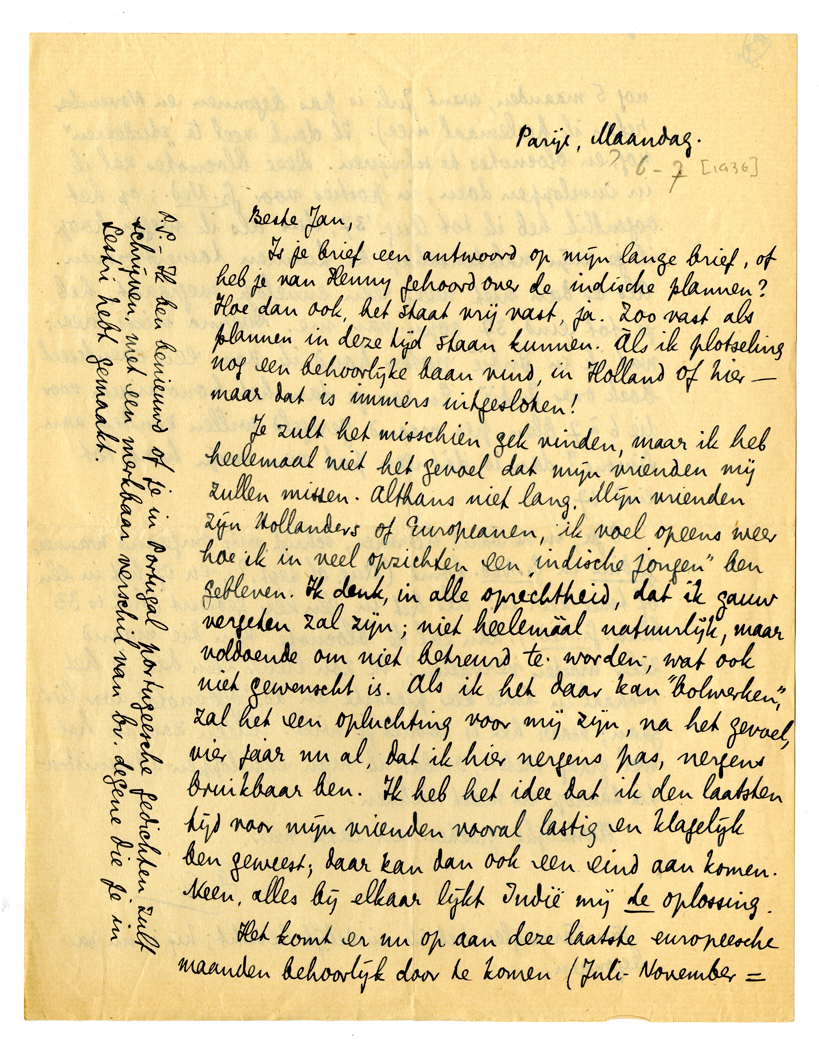 Je zult het misschien gek vinden, maar ik heb heelemaal niet het gevoel dat mijn vrienden mij zullen missen. Althans niet lang. Mijn vrienden zijn Hollanders of Europeanen, ik voel opeens weer hoe ik in veel opzichten een ‘indische jongen’ ben gebleven. Ik denk, in alle oprechtheid, dat ik gauw vergeten zal zijn; niet heelemààl natuurlijk, maar voldoende om niet betreurd te worden; wat ook niet gewenscht is. Als ik het daar kan ‘bolwerken’, zal het een opluchting voor mij zijn, na het gevoel, vier jaar nu al, dat ik hier nergens pas, nergens bruikbaar ben. Ik heb het idee dat ik den laatsten tijd voor mijn vrienden vooral lastig en klagelijk ben geweest; daar kan dan ook een eind aan komen. Neen, alles bij elkaar lijkt Indië mij de oplossing.