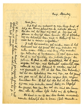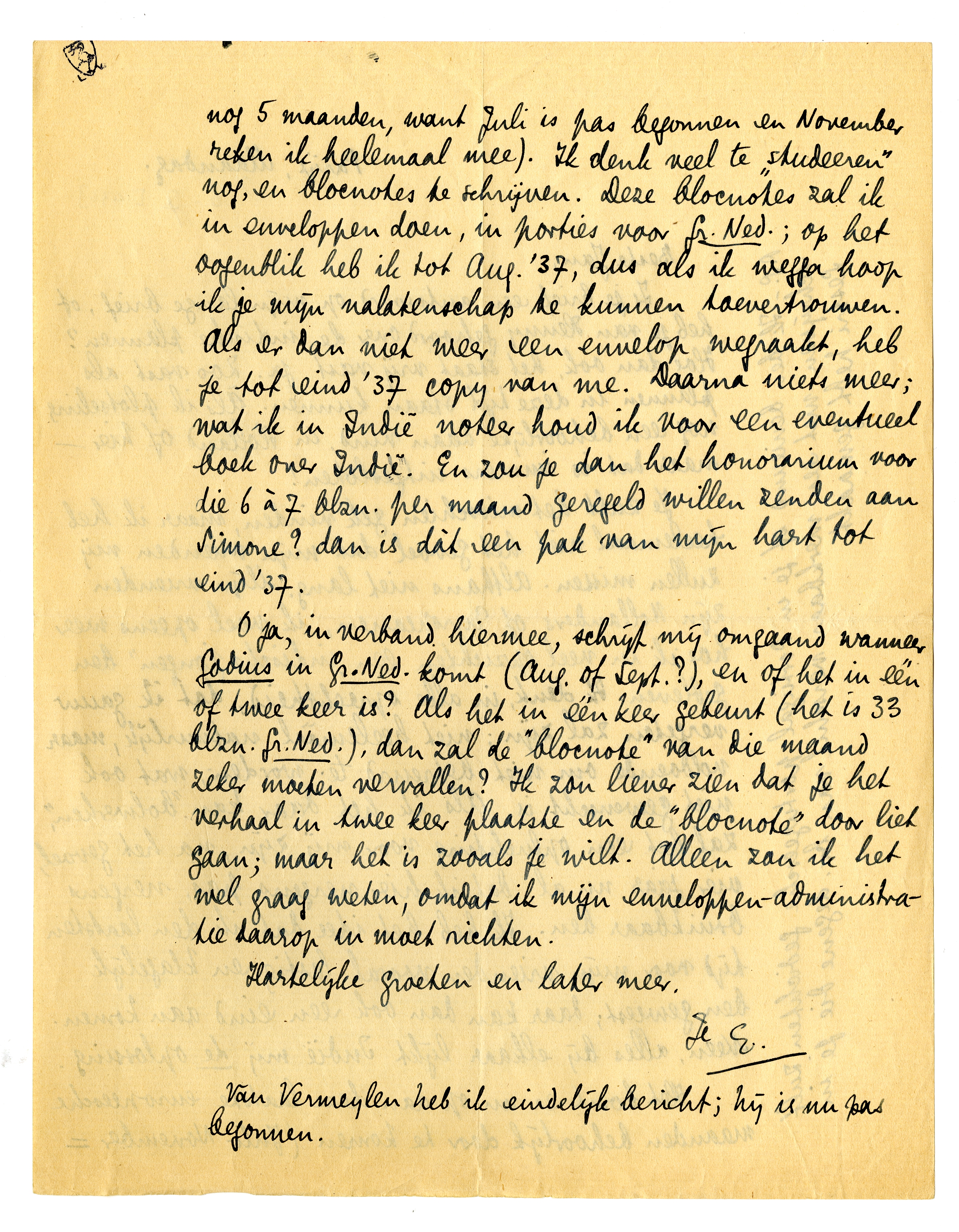 Het komt er nu op aan deze laatste europeesche maanden behoorlijk door te komen (Juli-November = nog 5 maanden, want Juli is pas begonnen en November reken ik heelemaal mee). Ik denk veel te ‘studeeren’ nog, en blocnotes te schrijven. Deze blocnotes zal ik in enveloppen doen, in porties voor Gr. Ned.; op het oogenblik heb ik tot Aug. '37, dus als ik wegga hoop ik je mijn nalatenschap te kunnen toevertrouwen. Als er dan niet weer een envelop wegraakt, heb je tot eind '37 copy van me. Daarna niets meer; wat ik in Indië noteer houd ik voor een eventueel boek over Indië. En zou je dan het honorarium voor die 6 à 7 blzn. per maand geregeld willen zenden aan Simone? dan is dàt een pak van mijn hart tot eind '37.