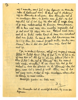 O ja, in verband hiermee, schrijf mij omgaand wanneer Godius in Gr. Ned. komt (Aug. of Sept.?), en of het in één of twee keer is? Als het in één keer gebeurt (het is 33 blzn. Gr. Ned.), dan zal de ‘blocnote’ van die maand zeker moeten vervallen? Ik zou liever zien dat je het verhaal in twee keer plaatste en de ‘blocnote’ door liet gaan; maar het is zooals je wilt. Alleen zou ik het wel graag weten, omdat ik mijn enveloppen-administratie daarop in moet richten.