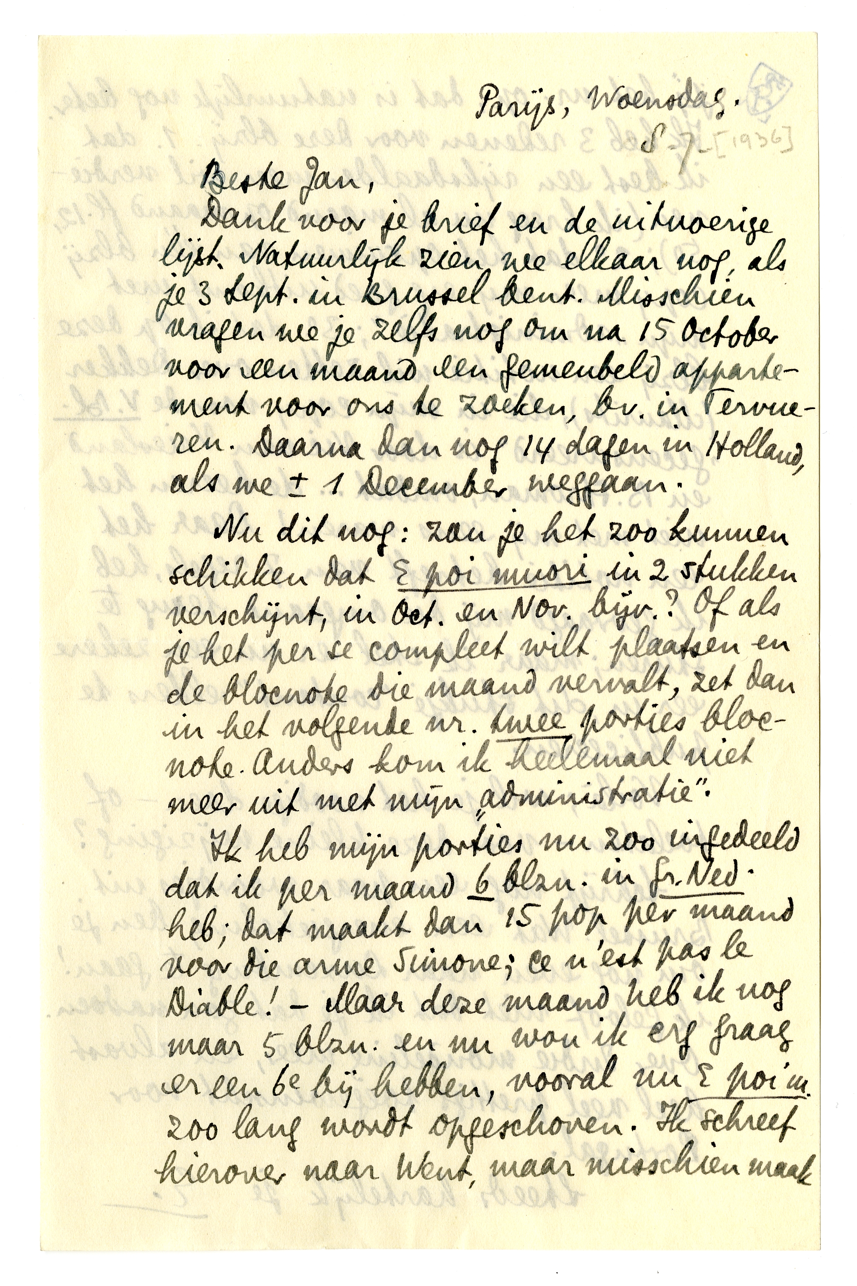 Ik heb mijn porties nu zoo ingedeeld dat ik per maand 6 blzn. in Gr. Ned. heb; dat maakt dan 15 pop per maand voor die arme Simone; ce n'est pas le Diable! - Maar deze maand heb ik nog maar 5 blzn. en nu wou ik erg graag er een 6e bij hebben, vooral nu E poi m. zoo lang wordt opgeschoven. Ik schreef hierover naar Went, maar misschien maak jij het nr. op, dat is natuurlijk nog beter. Ik heb 3 redenen voor deze blzij: 1. dat ik best een rijksdaalder meer wil verdienen (ik kreeg nu al maand op maand fl. 12,50); 2o. dat het opruimen van één blzij copy meer mij erg goed uitkomt met mijn ‘administratie’; 3o. dat ik op deze blzij een notitie wil zetten over Dekker (Maurits), die in mijn copy voor de V. Bl. ‘gecensureerd’ is door Vic van Vriesland en B. Stroman, omdat... de heeren het niet met mij eens waren! Daar het een notitie betreft van 7 regels, heb ik gevraagd mij die omgaand terug te sturen; maar ik stel er nu een zekere eer in, dit stukje ‘contant’ elders te publiceeren.