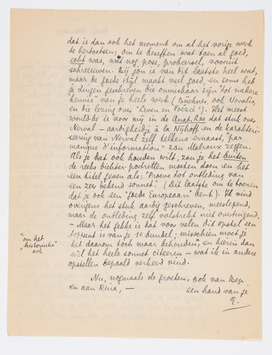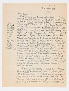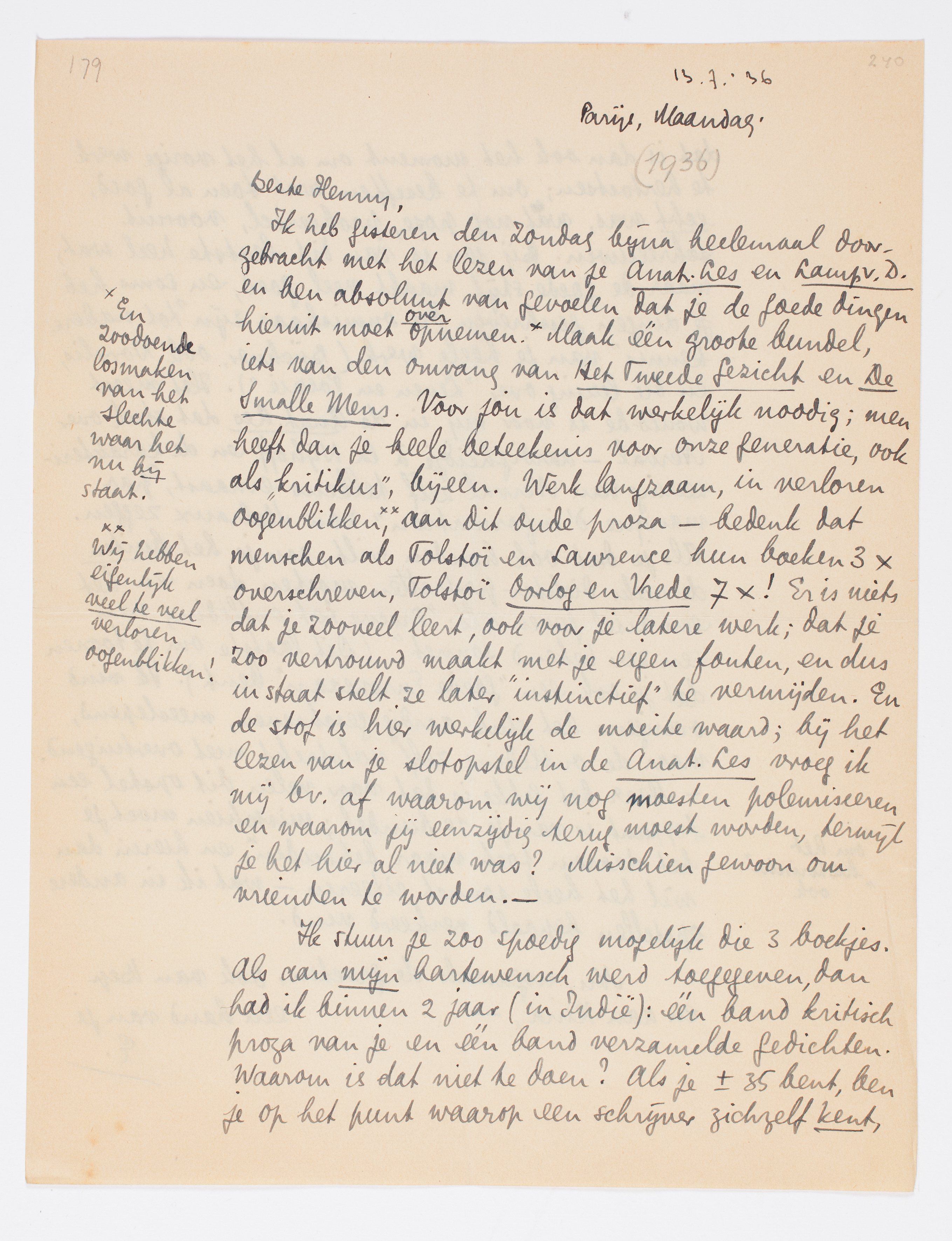 Ik heb gisteren den Zondag bijna heelemaal doorgebracht met het lezen van je Anat. Les en Lamp v. D. en ben absoluut van gevoelen dat je de goede dingen hieruit moet over/opnemen.4279 Maak één groote bundel, iets van den omvang van Het Tweede Gezicht en De Smalle Mens. Voor jou is dat werkelijk noodig; men heeft dan je heele beteekenis voor onze generatie, ook als ‘kritikus’, bijeen. Werk langzaam, in verloren oogenblikken,4280 aan dit oude proza - bedenk dat menschen als Tolstoï en Lawrence hun boeken 3 × overschreven, Tolstoï Oorlog en Vrede 7 ×! Er is niets dat je zooveel leert, ook voor je latere werk; dat je zoo vertrouwd maakt met je eigen fouten, en dus in in staat stelt ze later ‘instinctief’ te vermijden. En de stof is hier werkelijk de moeite waard; bij het lezen van je slotopstel in de Anat. Les4281 vroeg ik mij bv. af waarom wij nog moesten polemiseeren en waarom jij eenzijdig terug moest worden, terwijl je het hier al niet was? Misschien gewoon om vrienden te worden. -