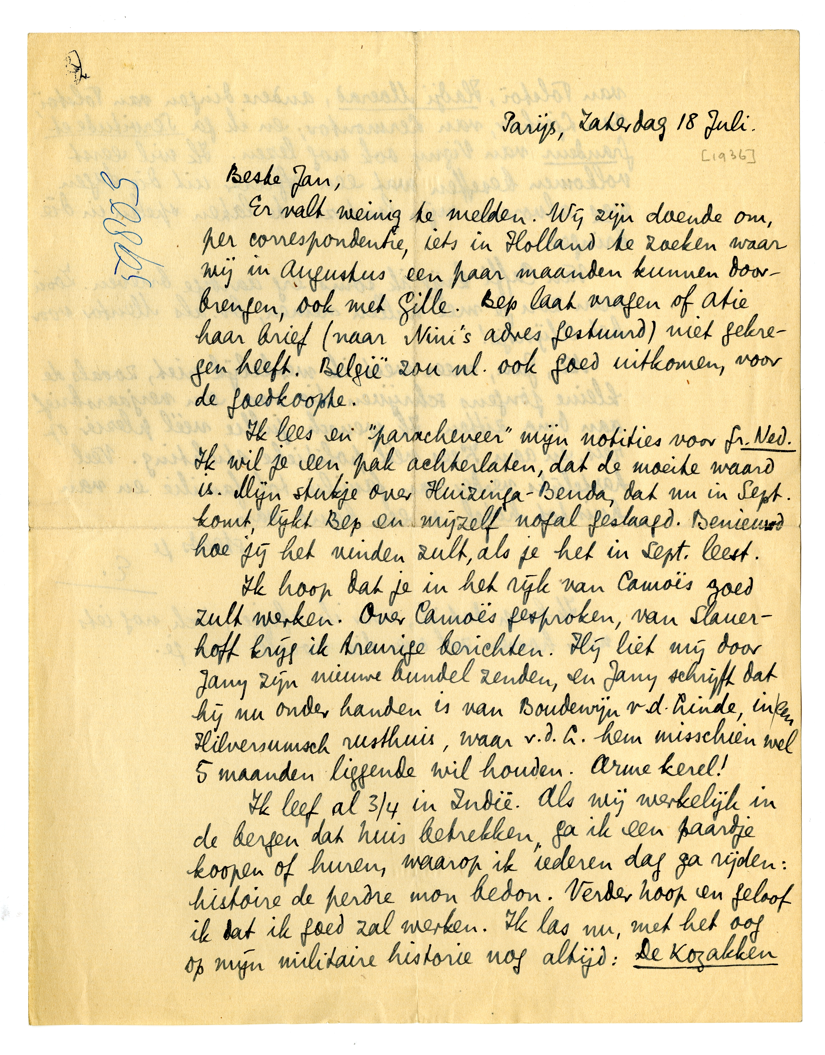 Ik lees en ‘paracheveer’ mijn notities voor Gr. Ned. Ik wil je een pak achterlaten, dat de moeite waard is. Mijn stukje over Huizinga-Benda,4296 dat nu in Sept. komt, lijkt Bep en mijzelf nogal geslaagd. Benieuwd hoe jij het vinden zult, als je het in Sept. leest.