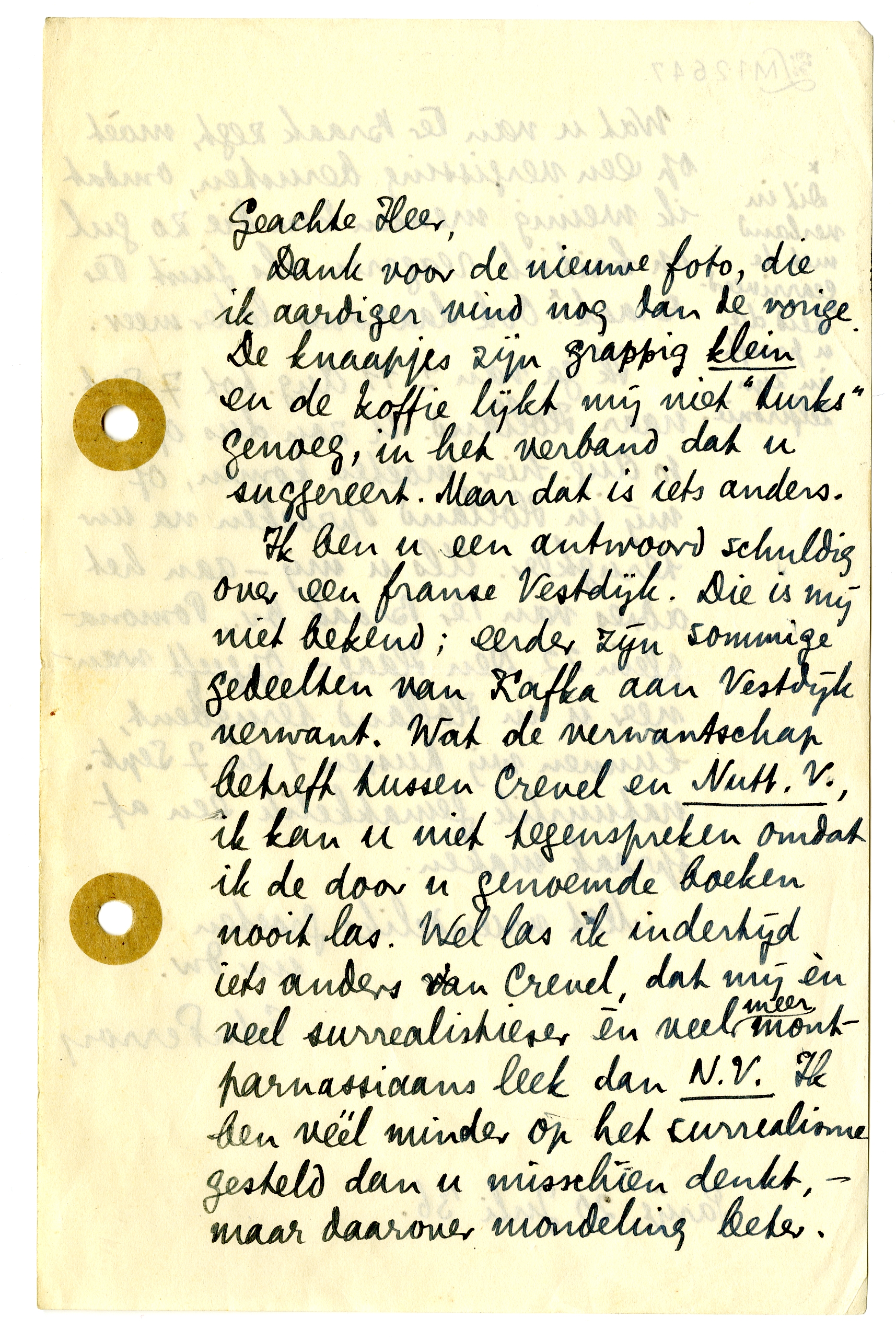 Ik ben u een antwoord schuldig over een franse Vestdijk.4300 Die is mij niet bekend; eerder zijn sommige gedeelten van Kafka aan Vestdijk verwant. Wat de verwantschap betreft tussen Crevel en Nutt. V., ik kan u niet tegenspreken omdat ik de door u genoemde boeken4301 nooit las. Wel las ik indertijd iets anders van Crevel,4302 dat mij èn veel surrealistieser èn veel meer montparnassiaans leek dan N.V. Ik ben véél minder op het surrealisme gesteld dan u misschien denkt, - maar daarover mondeling beter.