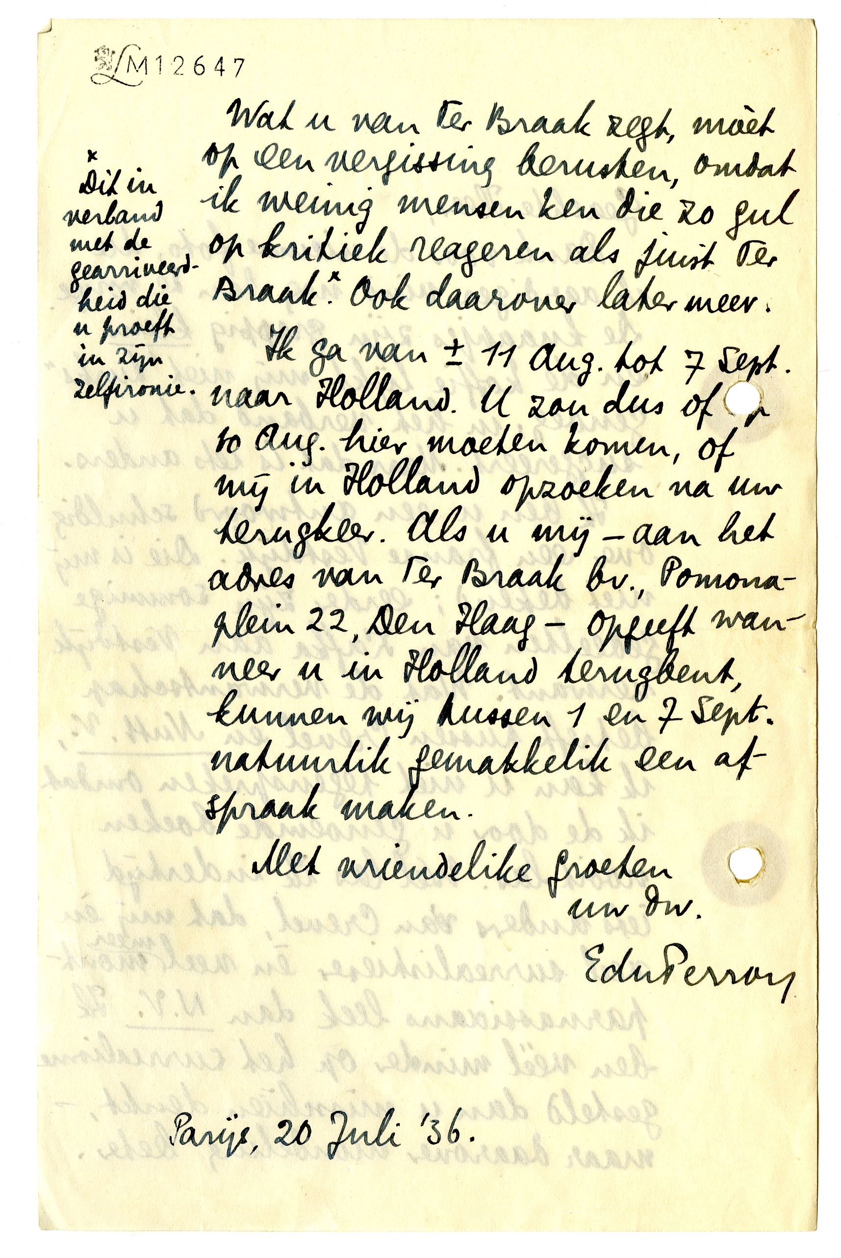 Ik ga van ± 11 Aug. tot 7 Sept. naar Holland. U zou dus of op 10 Aug. hier moeten komen, of mij in Holland opzoeken na uw terugkeer. Als u mij - aan het adres van Ter Braak bv., Pomonaplein 22, Den Haag - opgeeft wanneer u in Holland terugbent, kunnen wij tussen 1 en 7 Sept. natuurlik gemakkelik een afspraak maken.4304