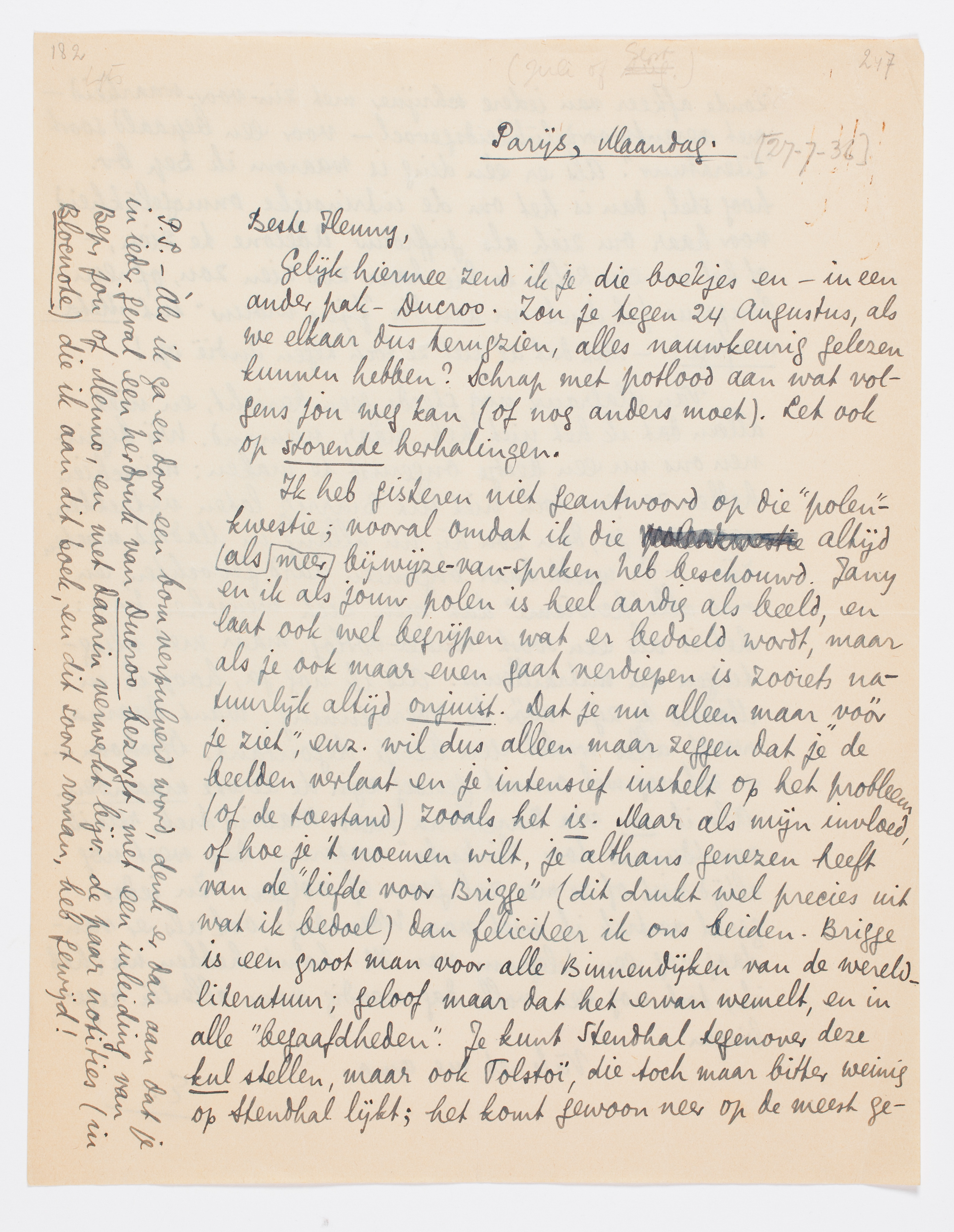 Gelijk hiermee zend ik je die boekjes en - in een ander pak - Ducroo. Zou je tegen 24 Augustus, als we elkaar dus terugzien, alles nauwkeurig gelezen kunnen hebben? Schrap met potlood aan wat volgens jou weg kan (of nog anders moet). Let ook op storende herhalingen.