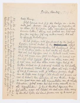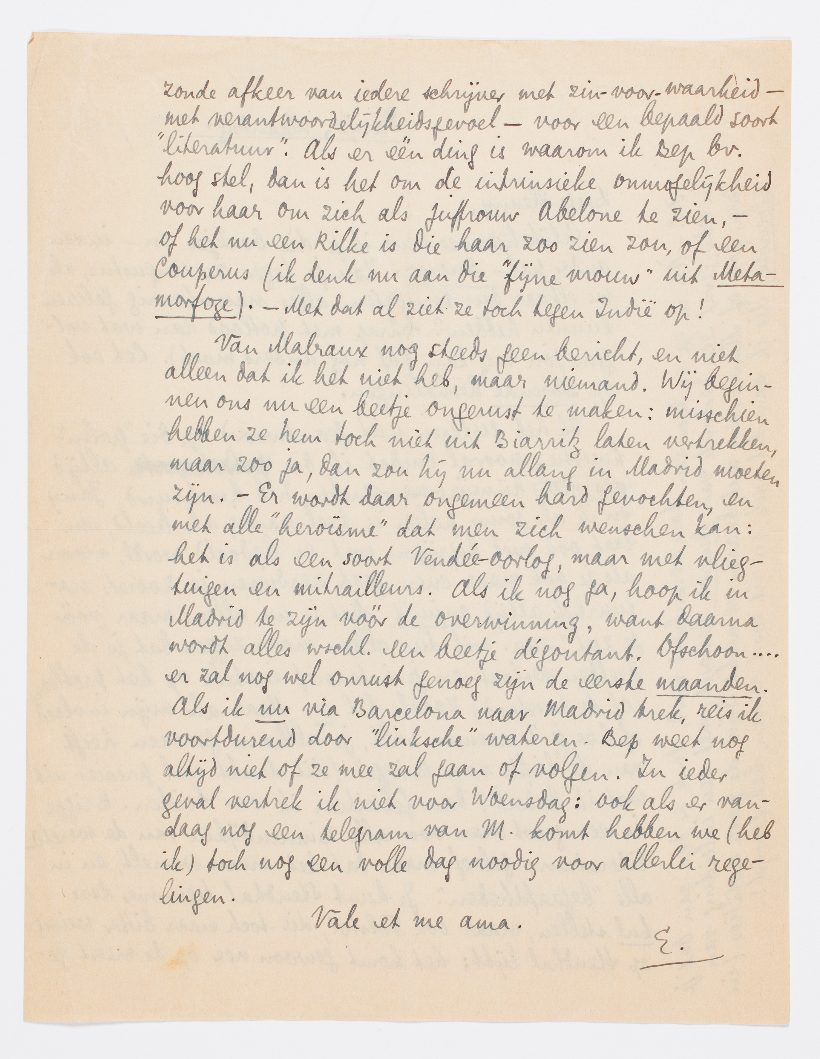 Van Malraux nog steeds geen bericht, en niet alleen dat ik het niet heb, maar niemand. Wij beginnen ons nu een beetje ongerust te maken: misschien hebben ze hem toch niet uit Biarritz laten vertrekken, maar zoo ja, dan zou hij nu allang in Madrid moeten zijn. - Er wordt daar ongemeen hard gevochten, en met alle ‘heroïsme’ dat men zich wenschen kan: het is als een soort Vendée-oorlog, maar met vliegtuigen en mitrailleurs. Als ik nog ga, hoop ik in Madrid te zijn vóór de overwinning, want daarna wordt alles wschl. een beetje dégoutant. Ofschoon... er zal nog wel onrust genoeg zijn de eerste maanden. Als ik nu via Barcelona naar Madrid trek, reis ik voortdurend door ‘linksche’ wateren. Bep weet nog altijd niet of ze mee zal gaan of volgen. In ieder geval vertrek ik niet voor Woensdag: ook als er vandaag nog een telegram van M. komt hebben we (heb ik) toch nog een volle dag noodig voor allerlei regelingen.