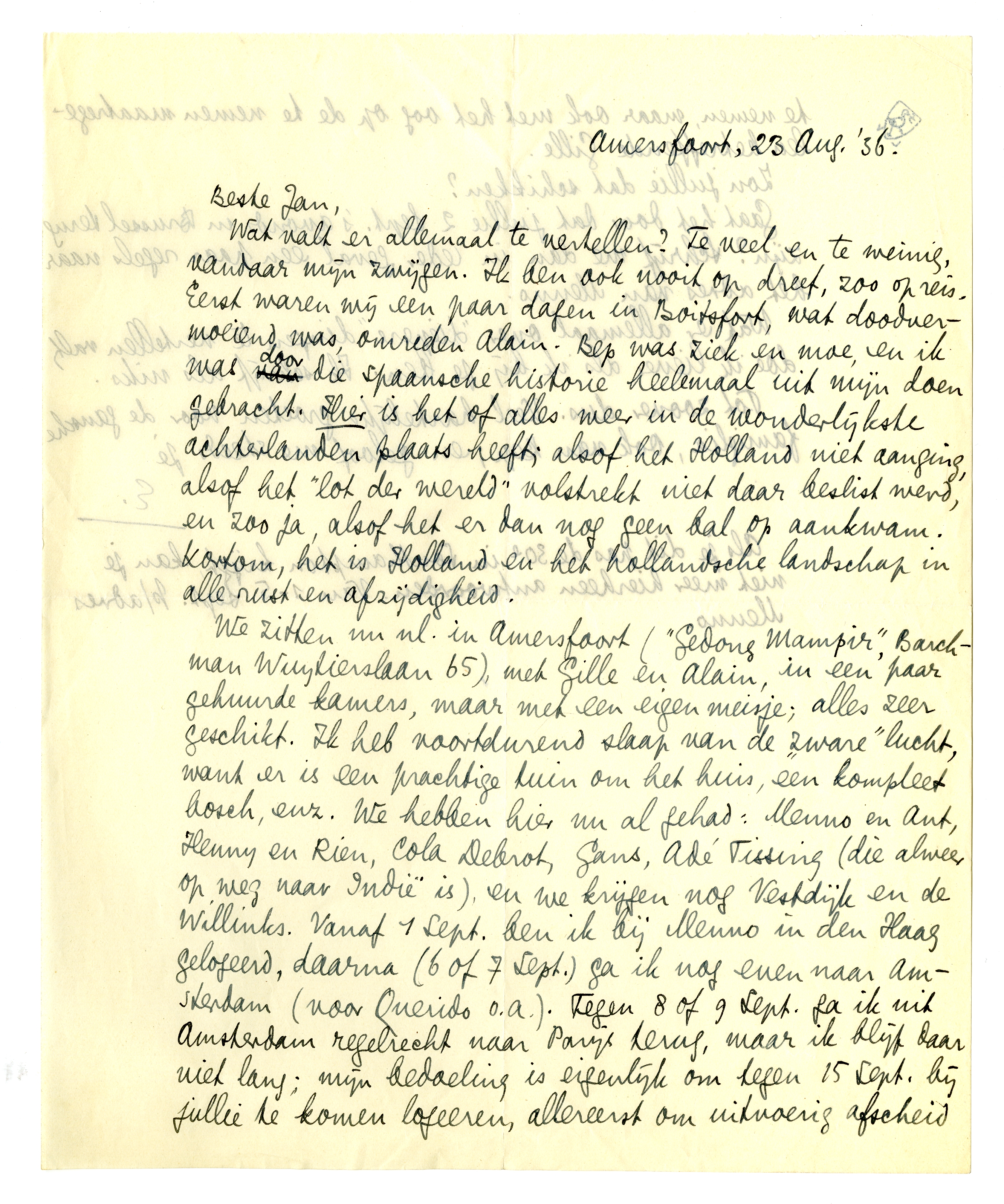 We zitten nu nl. in Amersfoort (‘Gedong Mampir’, Barchman Wuytierslaan 65), met Gille en Alain, in een paar gehuurde kamers, maar met een eigen meisje; alles zeer geschikt. Ik heb voortdurend slaap van de ‘zware’ lucht, want er is een prachtige tuin om het huis, een kompleet bosch, enz. We hebben hier nu al gehad: Menno en Ant, Henny en Rien, Cola Debrot, Gans, Adé Tissing (die alweer op weg naar Indië is), en we krijgen nog Vestdijk en de Willinks. Vanaf 1 Sept. ben ik bij Menno in den Haag gelogeerd, daarna (6 of 7 Sept.) ga ik nog even naar Amsterdam (voor Querido o.a.). Tegen 8 of 9 Sept. ga ik uit Amsterdam regelrecht naar Parijs terug, maar ik blijf daar niet lang; mijn bedoeling is eigenlijk om tegen 15 Sept. bij jullie te komen logeeren, allereerst om uitvoerig afscheid te nemen, maar ook met het oog op de te nemen maatregelen betreffende Gille.