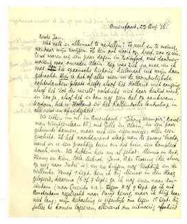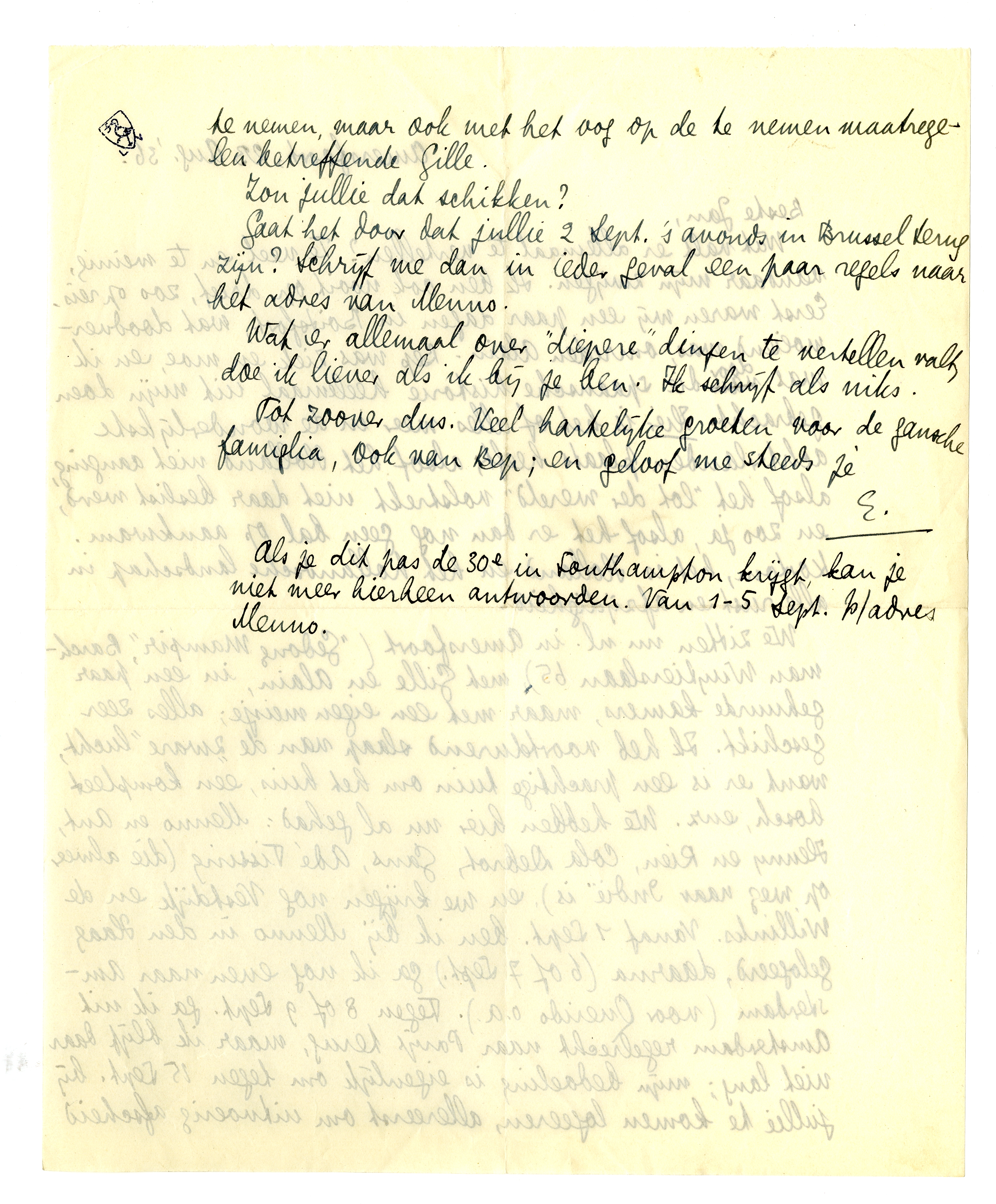 Gaat het door dat jullie 2 Sept. 's avonds in Brussel terug zijn? Schrijf me dan in ieder geval een paar regels naar het adres van Menno.
