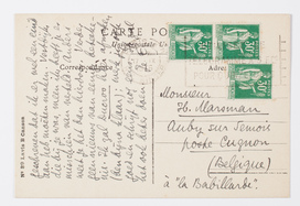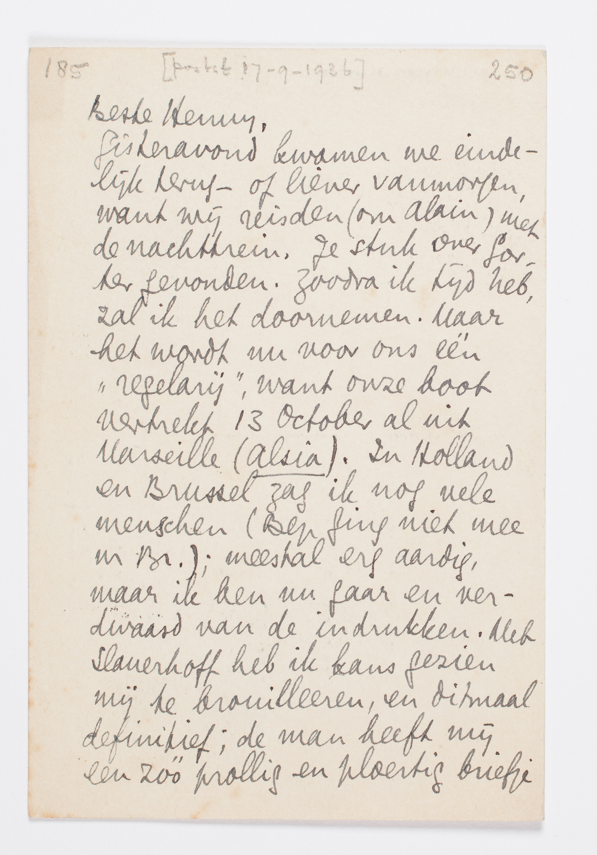 Gisteravond kwamen we eindelijk terug - of liever vanmorgen, want wij reisden (om Alain) met de nachttrein. Je stuk over Gorter4350 gevonden. Zoodra ik tijd heb, zal ik het doornemen. Maar het wordt nu voor ons één ‘regelarij’, want onze boot vertrekt 13 October al uit Marseille (Alsia). In Holland en Brussel zag ik nog vele menschen (Bep ging niet mee nr Br.); meestal erg aardig, maar ik ben nu gaar en verdwaasd van de indrukken. Met Slauerhoff heb ik kans gezien mij te brouilleeren, en ditmaal definitief; de man heeft mij een zóó prollig en ploertig briefje geschreven dat ik er wel een eind aan heb moéten maken.4351 Vestdijk die bij je was, meen ik, heeft je er misschien van verteld. Anders weet je het dan hierdoor. Verder geen nieuws van eenige beteekenis. Ik zal Ducroo hiér afmaken (ben bijna klaar); werk jij ook goed en schrijf nog eens. Ik zal het ook beter doen.