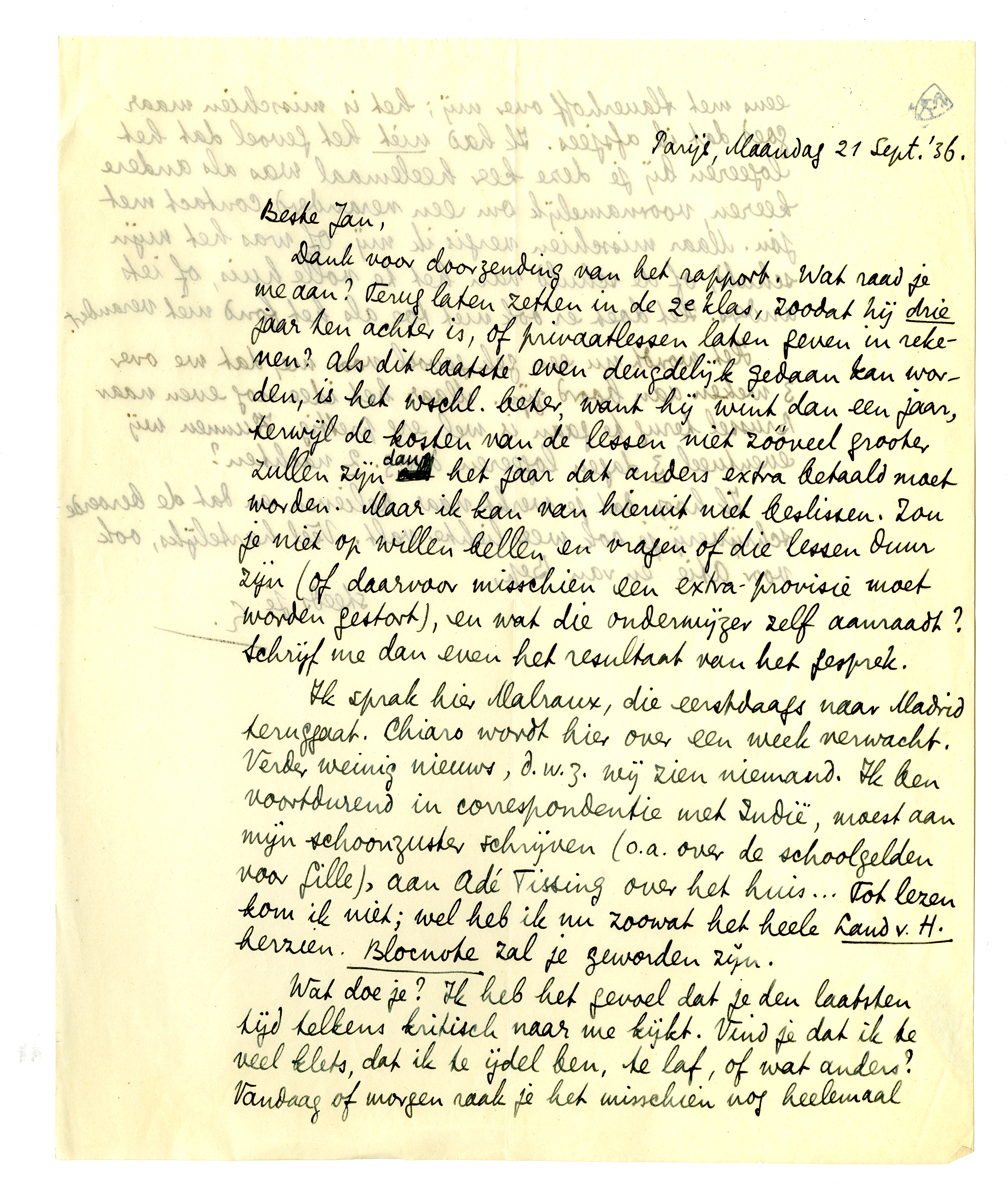 Ik sprak hier Malraux, die eerstdaags naar Madrid teruggaat. Chiaro wordt hier over een week verwacht. Verder weinig nieuws, d.w.z. wij zien niemand. Ik ben voortdurend in correspondentie met Indië, moest aan mijn schoonzuster schrijven (o.a. over de schoolgelden voor Gille), aan Adé Tissing over het huis... Tot lezen kom ik niet; wel heb ik nu zoowat het heele Land v. H. herzien. Blocnote zal je geworden zijn.