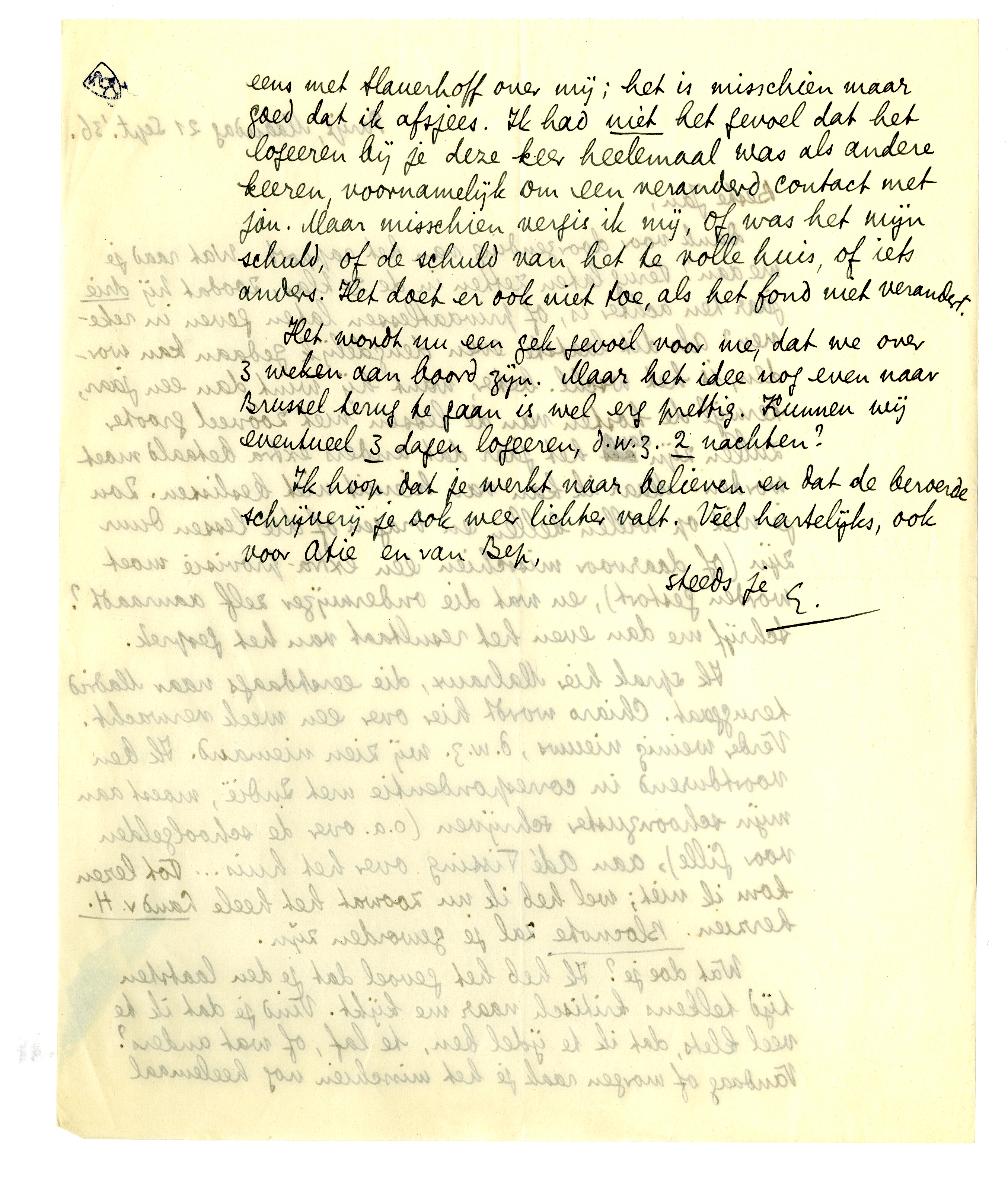 Het wordt nu een gek gevoel voor me, dat we over 3 weken aan boord zijn. Maar het idee nog even naar Brussel terug te gaan is wel erg prettig. Kunnen wij eventueel 3 dagen logeeren, d.w.z. 2 nachten?