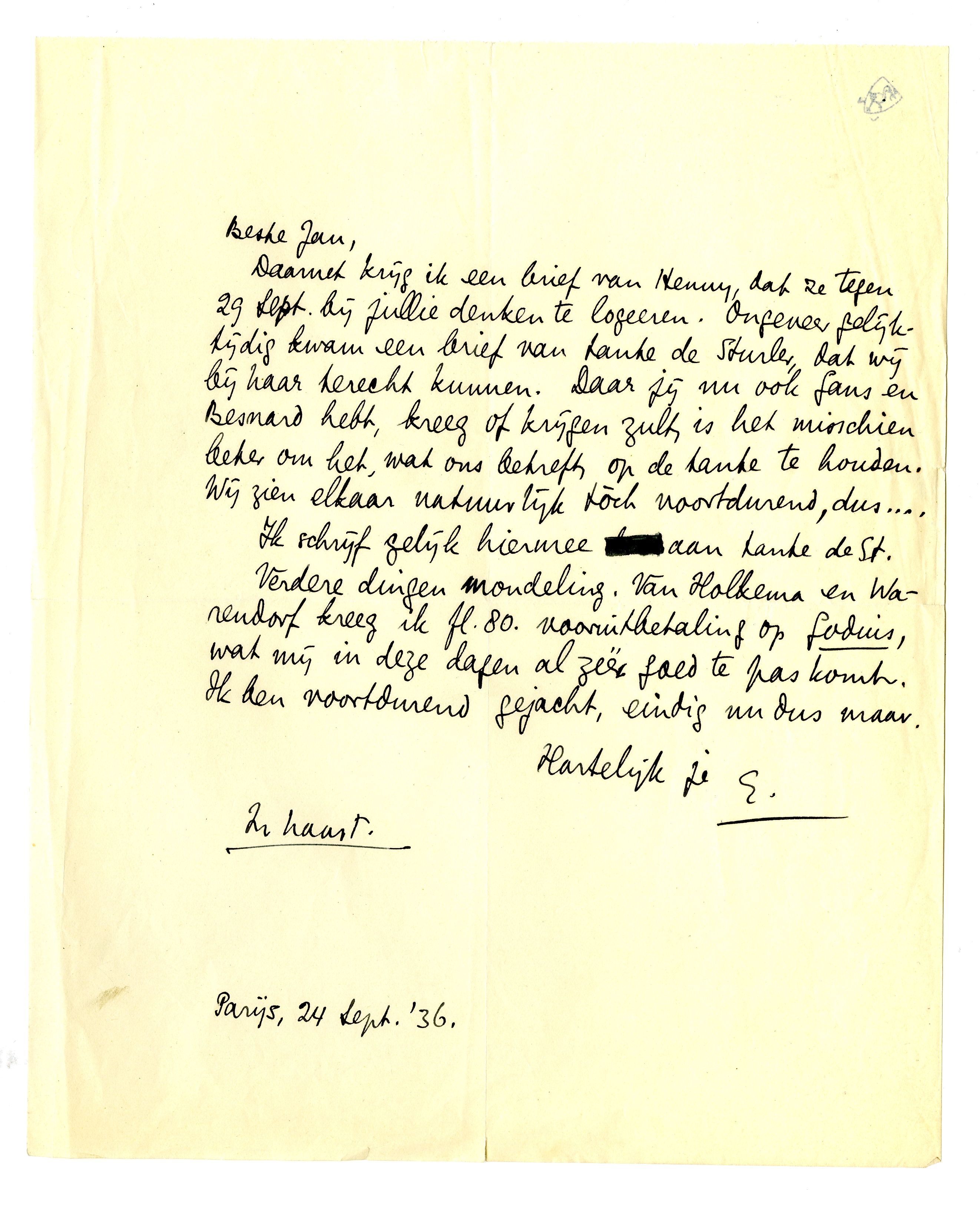Daarnet krijg ik een brief van Henny, dat ze tegen 29 Sept. bij jullie denken te logeeren. Ongeveer gelijktijdig kwam een brief van tante de Sturler, dat wij bij haar terecht kunnen. Daar jij nu ook Gans en Besnard hebt, kreeg of krijgen zult, is het misschien beter om het, wat ons betreft, op tante te houden. Wij zien elkaar natuurlijk tòch voortdurend, dus....