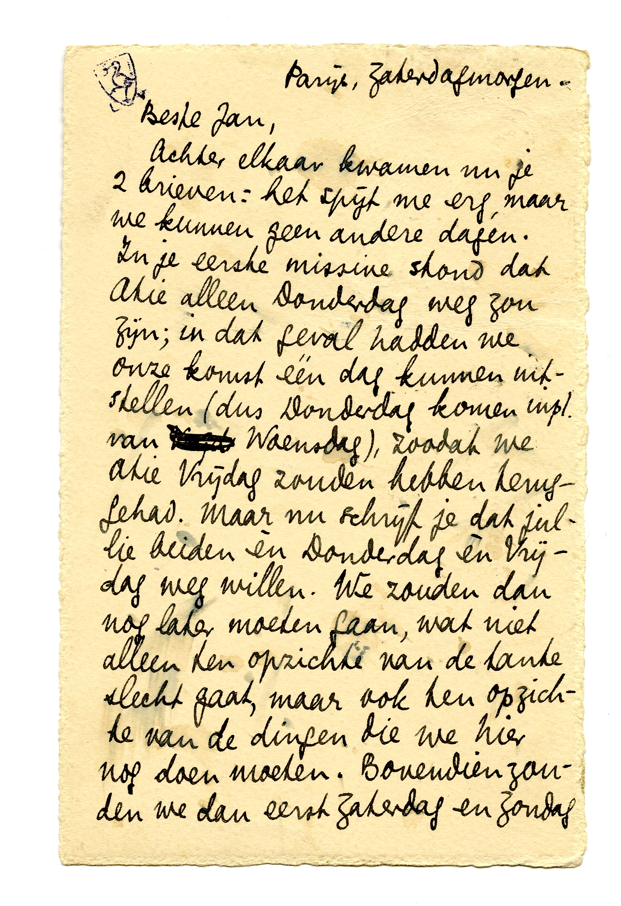 Achter elkaar kwamen nu je 2 brieven: het spijt me erg, maar we kunnen geen andere dagen. In je eerste missive stond dat Atie alleen Donderdag weg zou zijn; in dat geval hadden we onze komst één dag kunnen uitstellen (dus Donderdag komen inpl. van Woensdag), zoodat we Atie Vrijdag zouden hebben teruggehad. Maar nu schrijf je dat jullie beiden èn Donderdag èn Vrijdag weg willen. We zouden dan nog later moeten gaan, wat niet alleen ten opzichte van de tante slecht gaat, maar ook ten opzichte van de dingen die we hier nog doen moeten. Bovendien zouden we dan eerst Zaterdag en Zondag wat aan elkaar hebben, en ik heb expres alles erop ingericht om dan niet in Brussel te zijn, omdat je me dat de vorige keer vroeg met het oog op de jongens. Na Zondag wordt te laat voor ons. Het beste zou dus zijn als jij inderdaad je reis voor deze keer kon uitstellen. Schrijf omgaand.