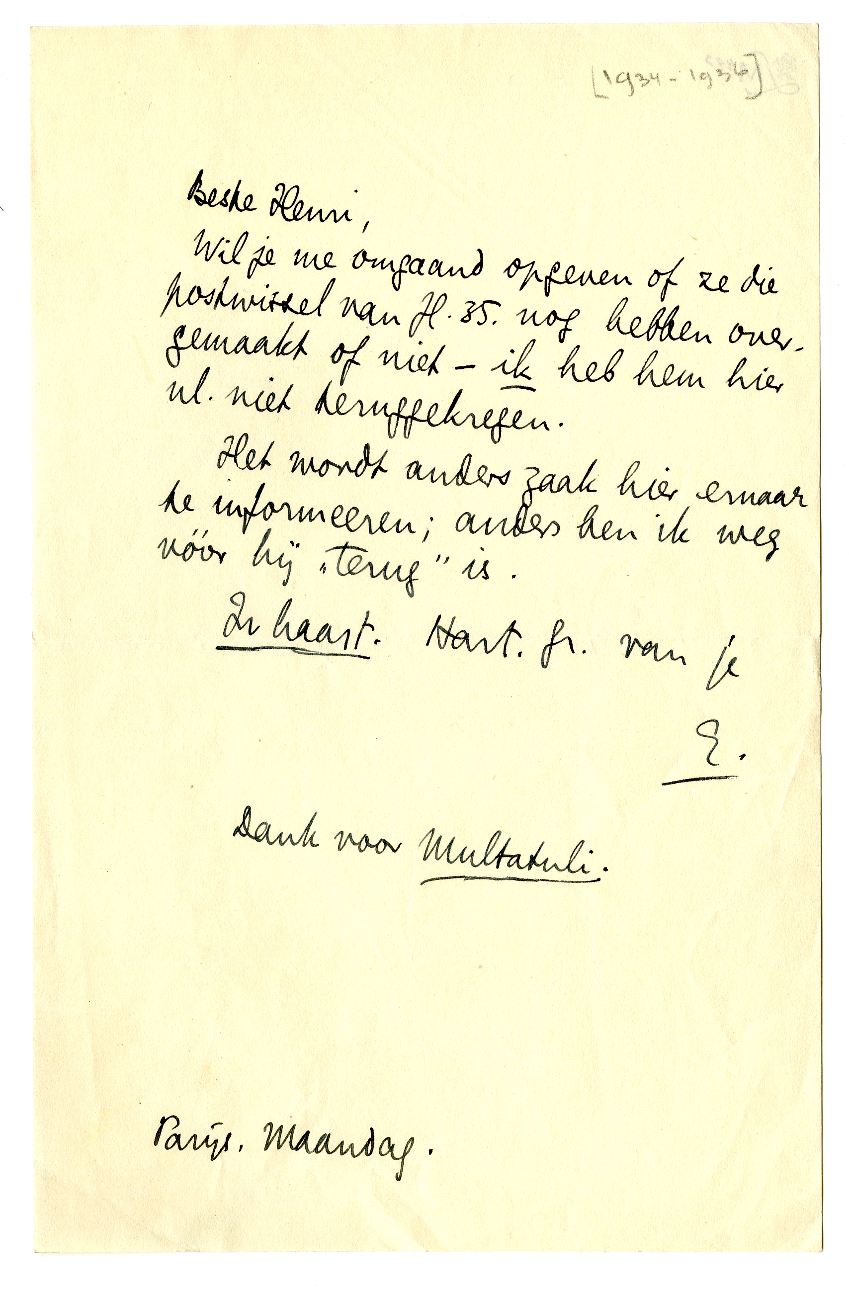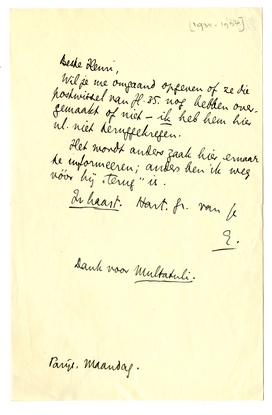 Wil je me omgaand opgeven of ze die postwissel van fl. 35. nog hebben overgemaakt of niet - ik heb hem hier nl. niet teruggekregen.