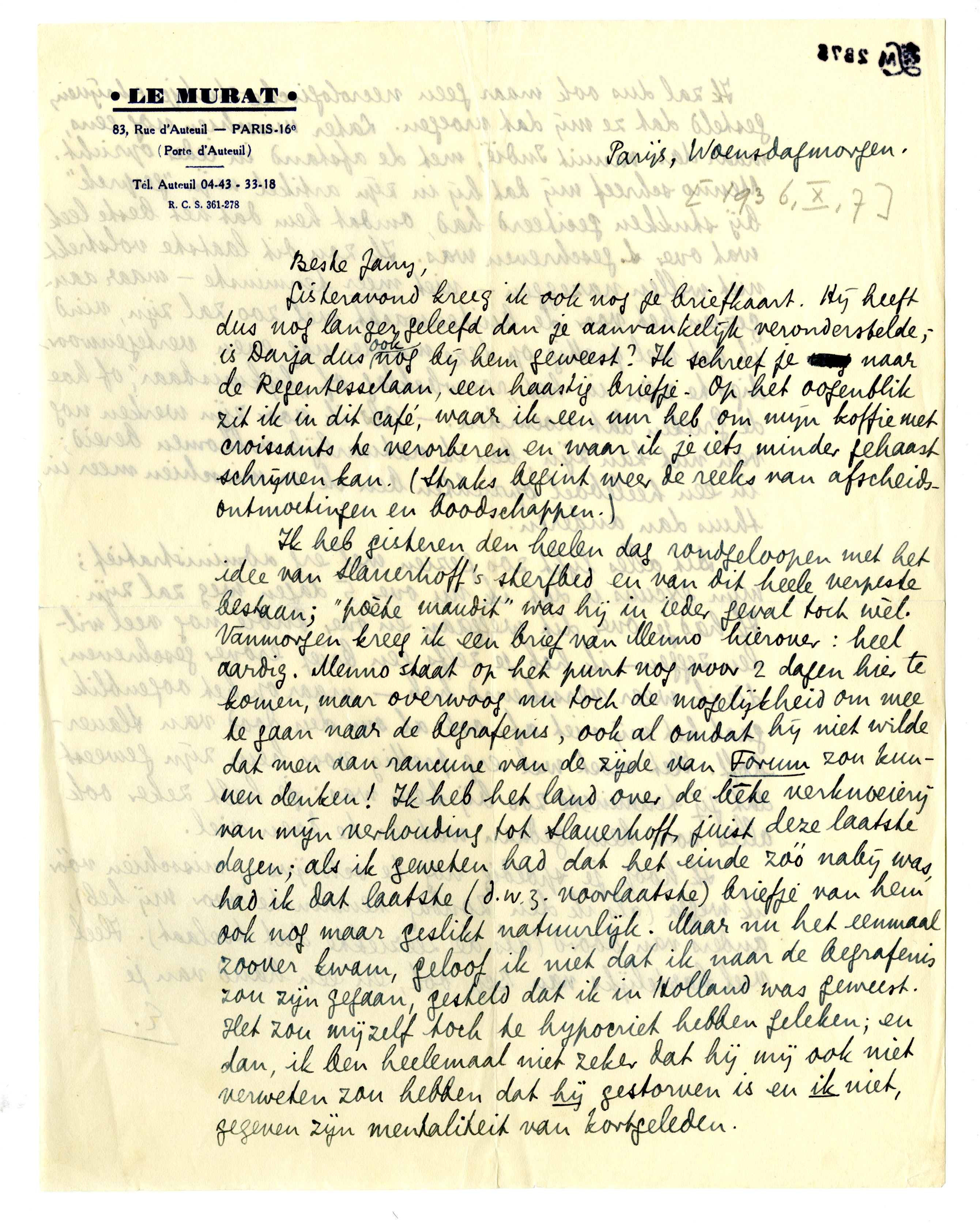 Gisteravond kreeg ik ook nog je briefkaart. Hij heeft dus nog langer geleefd dan je aanvankelijk veronderstelde; is Darja dus ook nog bij hem geweest? Ik schreef je naar de Regentesselaan, een haastig briefje. Op het oogenblik zit ik in dit café, waar ik een uur heb om mijn koffie met croissants te verorberen en waar ik je iets minder gehaast schrijven kan. (Straks begint weer de reeks van afscheidsont-moetingen en boodschappen.)