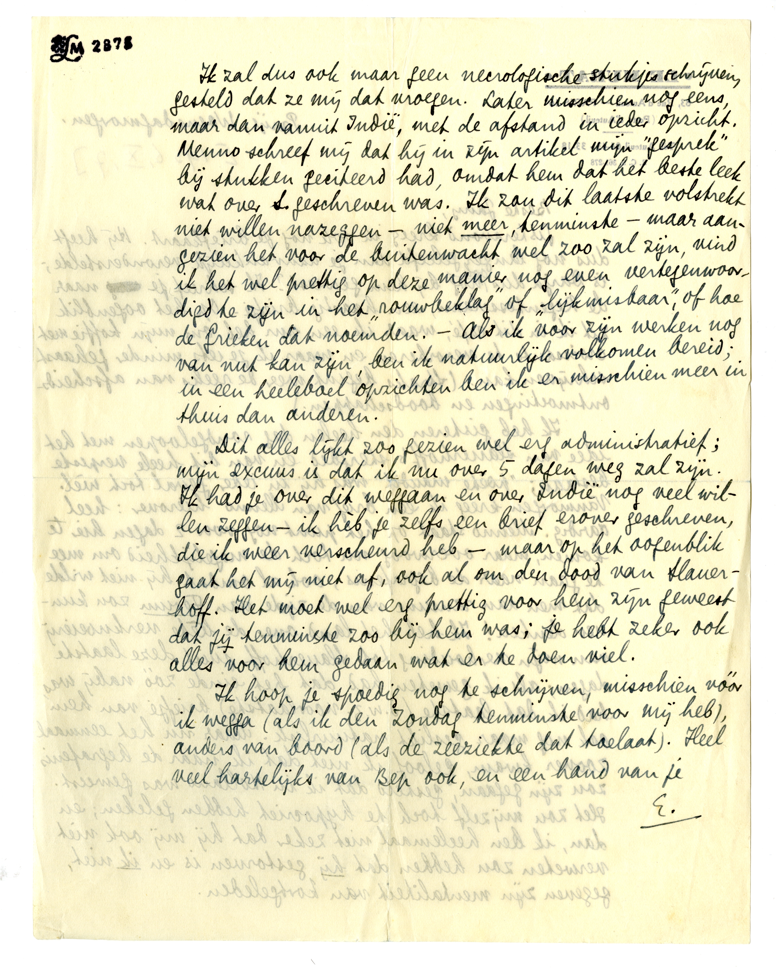 Ik zal dus ook maar geen necrologische-stukjes schrijven, gesteld dat ze mij dat vroegen. Later misschien nog eens, maar dan vanuit Indië, met de afstand in ieder opzicht. Menno schreef mij dat hij in zijn artikel mijn ‘gesprek’4378 bij stukken geciteerd had, omdat hem dat het beste leek wat over S. geschreven was. Ik zou dit laatste volstrekt niet willen nazeggen - niet meer, tenminste - maar aangezien het voor de buitenwacht wel zoo zal zijn, vind ik het wel prettig op deze manier nog even vertegenwoordigd te zijn in het ‘rouwbeklag’ of ‘lijkmisbaar’, of hoe de Grieken dat noemden. - Als ik voor zijn werken nog van nut kan zijn, ben ik natuurlijk volkomen bereid; in een heeleboel opzichten ben ik er misschien meer in thuis dan anderen.