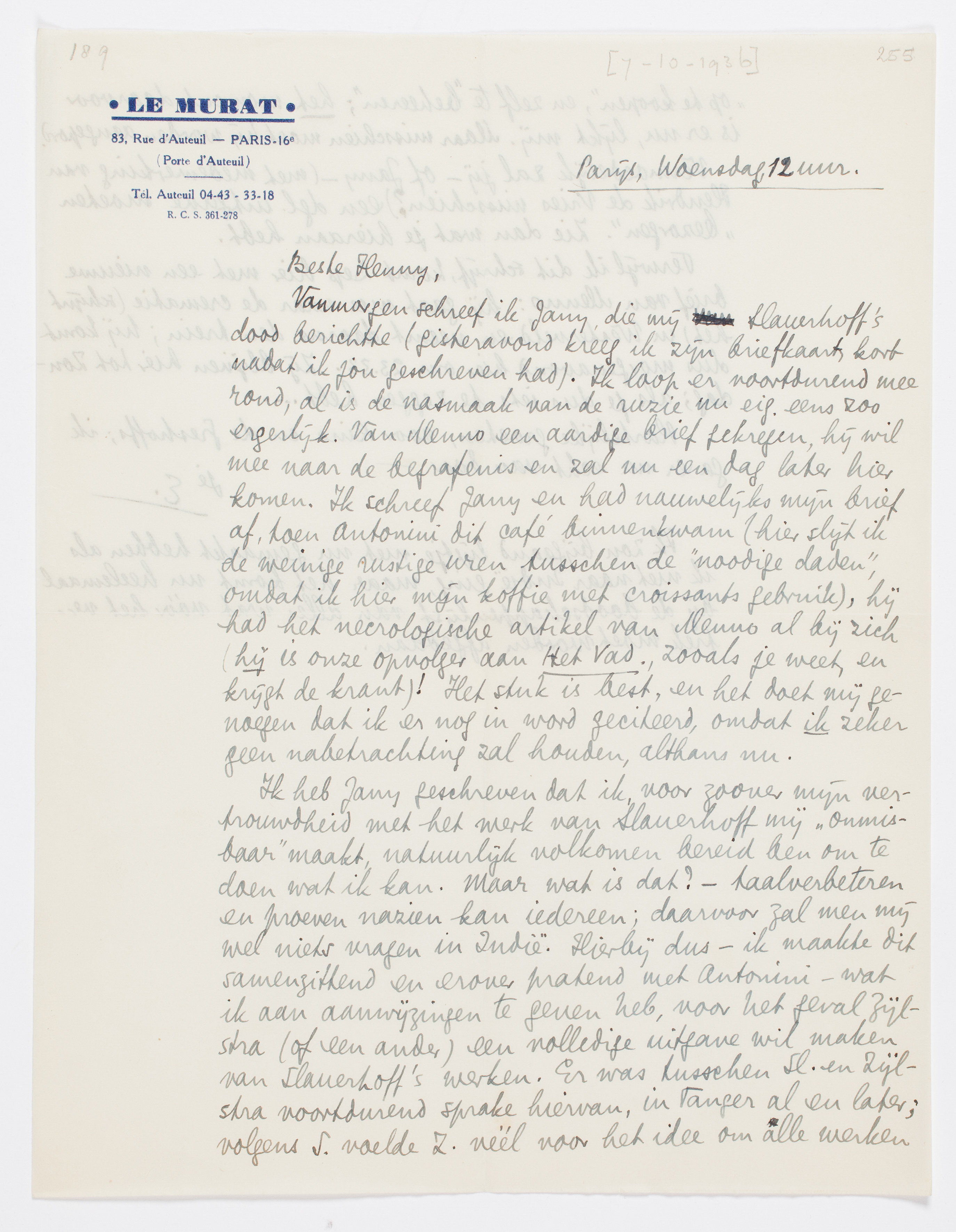 Vanmorgen schreef ik Jany, die mij Slauerhoff's dood berichtte (gisteravond kreeg ik zijn briefkaart, kort nadat ik jou geschreven had). Ik loop er voortdurend mee rond, al is de nasmaak van de ruzie nu eig. eens zoo ergerlijk. Van Menno een aardige brief gekregen, hij wil mee naar de begrafenis en zal nu een dag later hier komen. Ik schreef Jany en had nauwelijks mijn brief af, toen Antonini dit café binnenkwam (hier slijt ik de weinige rustige uren tusschen de ‘noodige daden’, omdat ik hier mijn koffie met croissants gebruik), hij had het necrologische artikel van Menno al bij zich (hij is onze opvolger aan Het Vad., zooals je weet, en krijgt de krant)! Het stuk is best, en het doet mij genoegen dat ik er nog in word geciteerd, omdat ik zeker geen nabetrachting zal houden, althans nu.