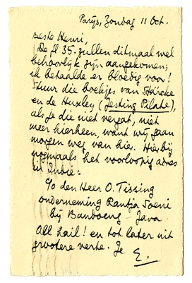 De fl. 35. zullen ditmaal wel behoorlijk zijn aangekomen; ik betaalde er bloedig voor! Stuur die boekjes van Stärcke en de Huxley (Jesting Pilate), als je die niet vergat, niet meer hierheen, want wij gaan morgen weg van hier. Hierbij nogmaals het voorloopig adres in Indië: