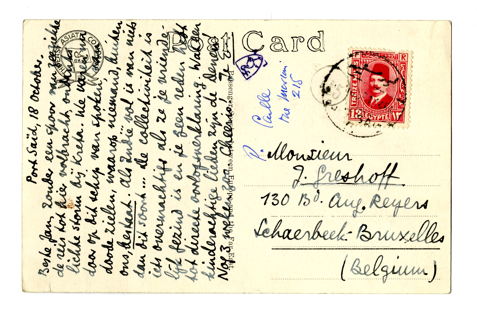 Beste Jan, Zonder een spoor van zeeziekte de reis tot hier volbracht, ondanks lichte storm bij Kreta. We varen nu door op dit schip van spoken, van doode zielen, waarop niemand, buiten ons, bestaat. Als Indië vol is van niets dan dit soort... De collectiviteit is iets overmachtigs als ze je vriendelijk gezind is en je geen reden hebt tot directe oorlogsverklaring. Wat een kinderachtige lieden zijn de Denen! Nog 3 weken zoo. Cheerio!