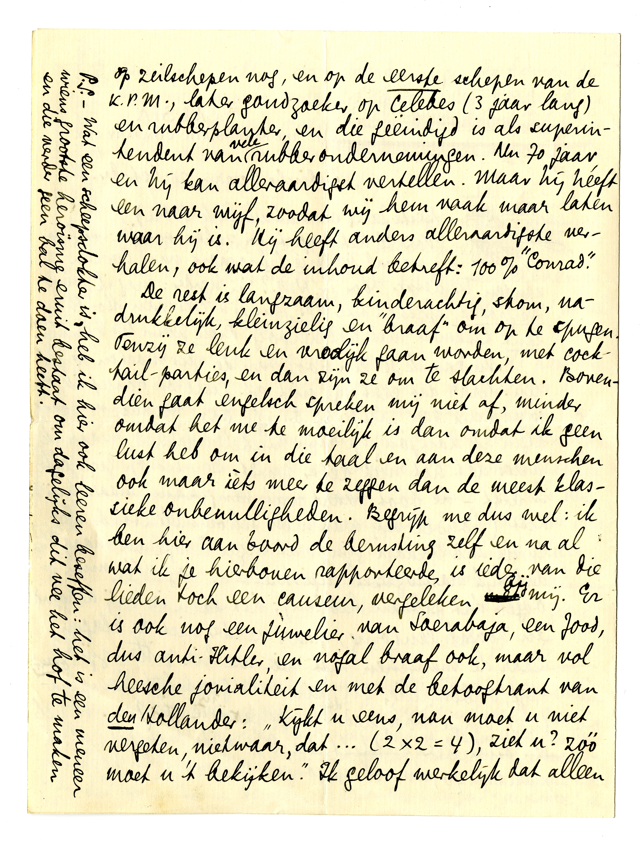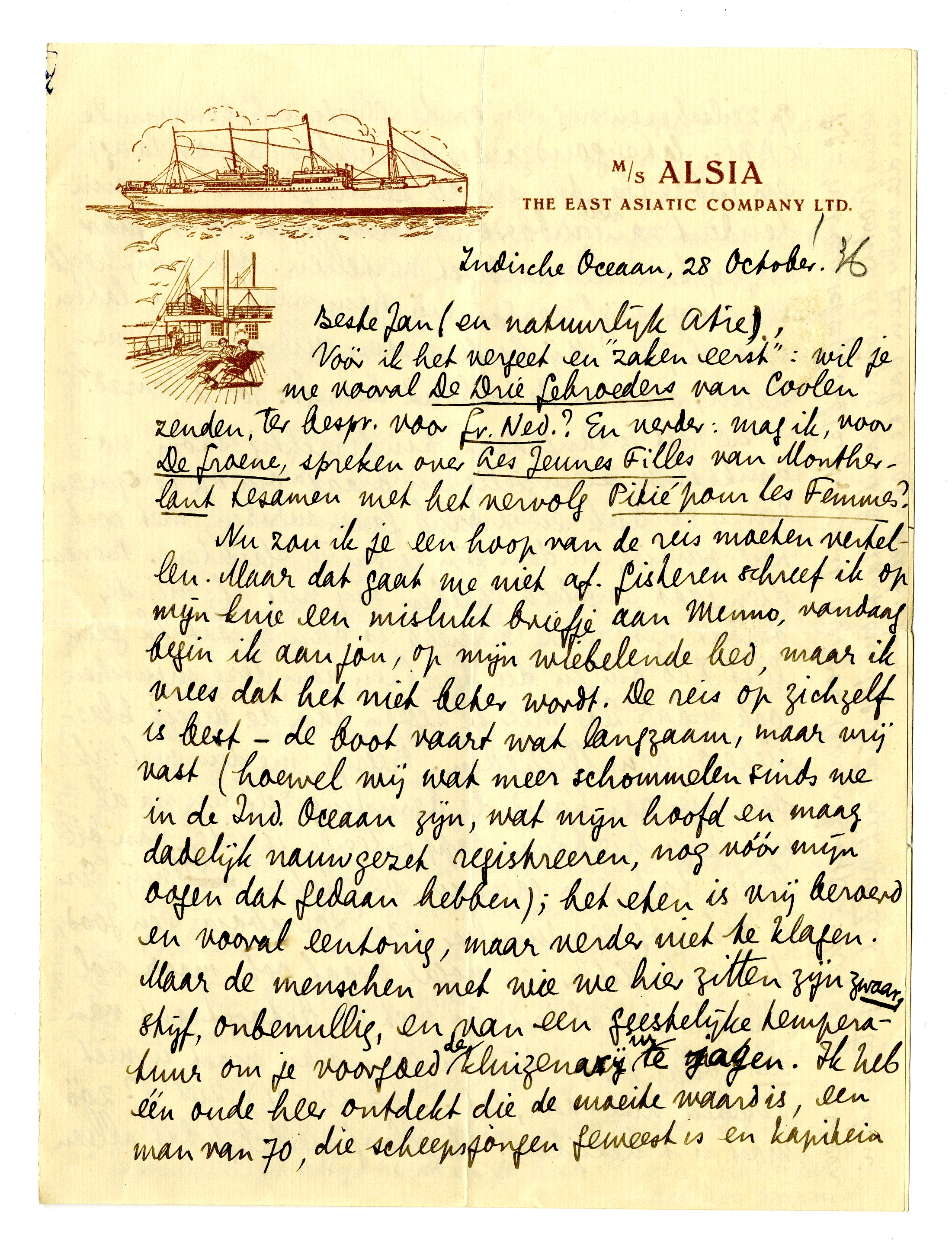 Nu zou ik je een hoop van de reis moeten vertellen. Maar dat gaat me niet af. Gisteren schreef ik op mijn knie een mislukt briefje aan Menno, vandaag begin ik aan jou, op mijn wiebelende bed, maar ik vrees dat het niet beter wordt. De reis op zichzelf is best - de boot vaart wat langzaam, maar vrij vast (hoewel wij wat meer schommelen sinds we in de Ind. Oceaan zijn, wat mijn hoofd en maag dadelijk nauwgezet registreeren, nog vóór mijn oogen dat gedaan hebben); het eten is vrij beroerd en vooral eentonig, maar verder niet te klagen. Maar de menschen met wie we hier zitten zijn zwaar, stijf, onbenullig, en van een geestelijke temperatuur om je voorgoed de kluizenarij in te jagen. Ik heb één oude heer ontdekt die de moeite waard is, een man van 70, die scheepsjongen geweest is en kapitein op zeilschepen nog, en de eerste schepen van de K.P.M., later goudzoeker op Celebes (3 jaar lang) en rubberplanter, en die geëindigd is als superintendent van vele rubberondernemingen. Nu 70 jaar, en hij kan alleraardigst vertellen. Maar hij heeft een naar wijf, zoodat wij hem vaak maar laten waar hij is. Hij heeft anders alleraardigste verhalen, ook wat de inhoud betreft: 100% ‘Conrad’.