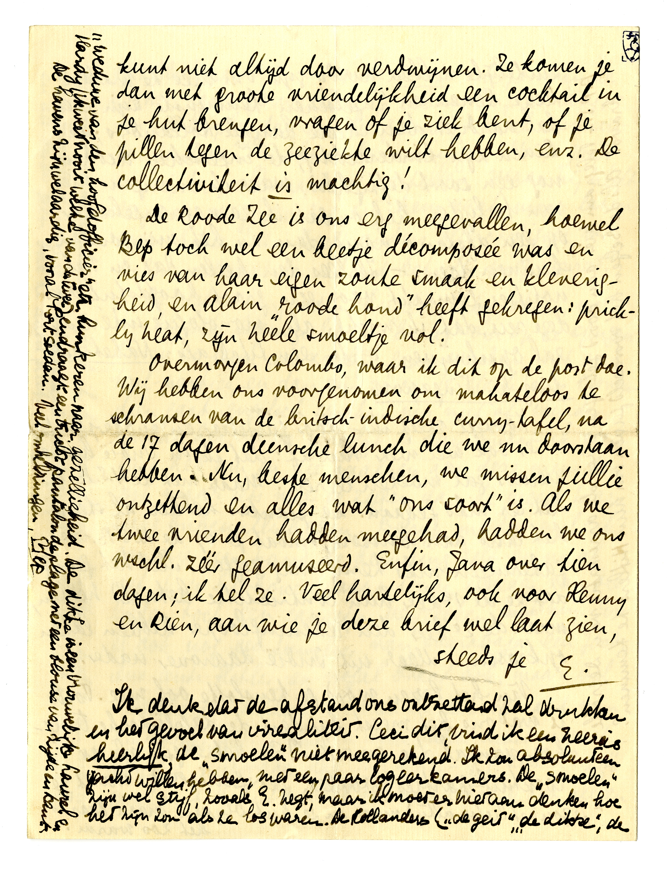 Overmorgen Colombo, waar ik dit op de post doe. Wij hebben ons voorgenomen om mahateloos te schransen van de britsch-indische curry-tafel, na de 17 dagen deensche lunch die we nu doorstaan hebben. Nu, beste menschen, we missen jullie ontzettend en alles wat ‘ons soort’ is. Als we twee vrienden hadden meegehad, hadden we ons wschl. zéér geamuseerd. Enfin, Java over tien dagen; ik tel ze. Veel hartelijks, ook voor Henny en Rien, aan wie je deze brief wel laat zien, steeds je