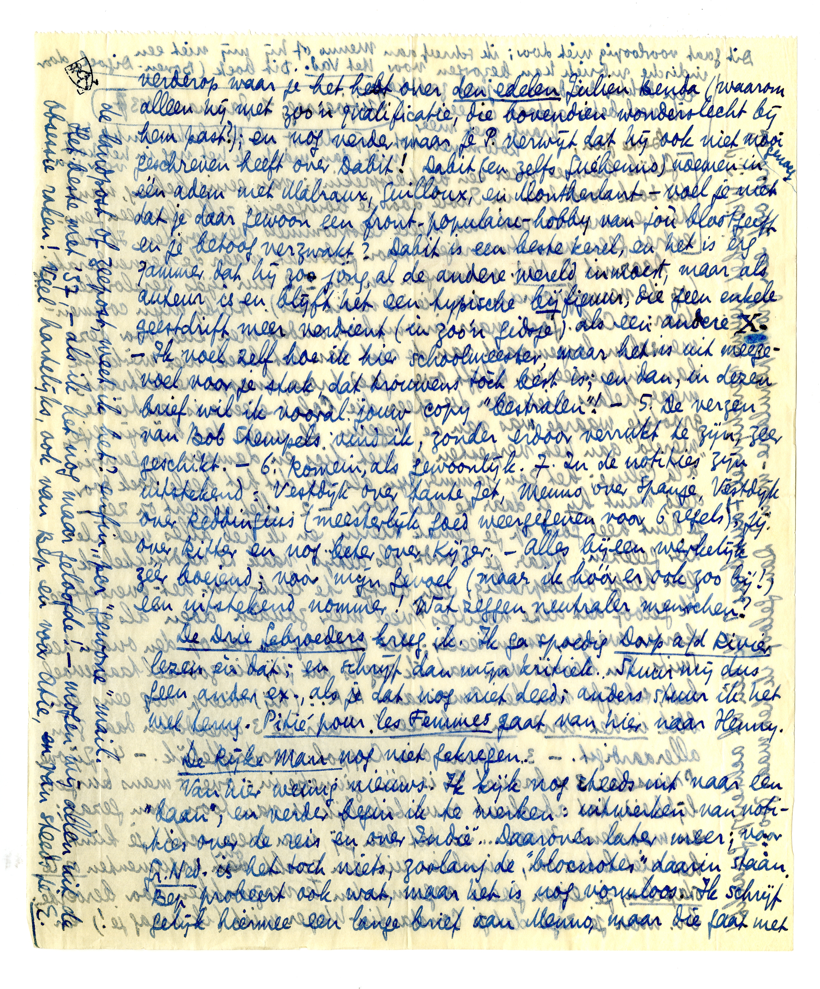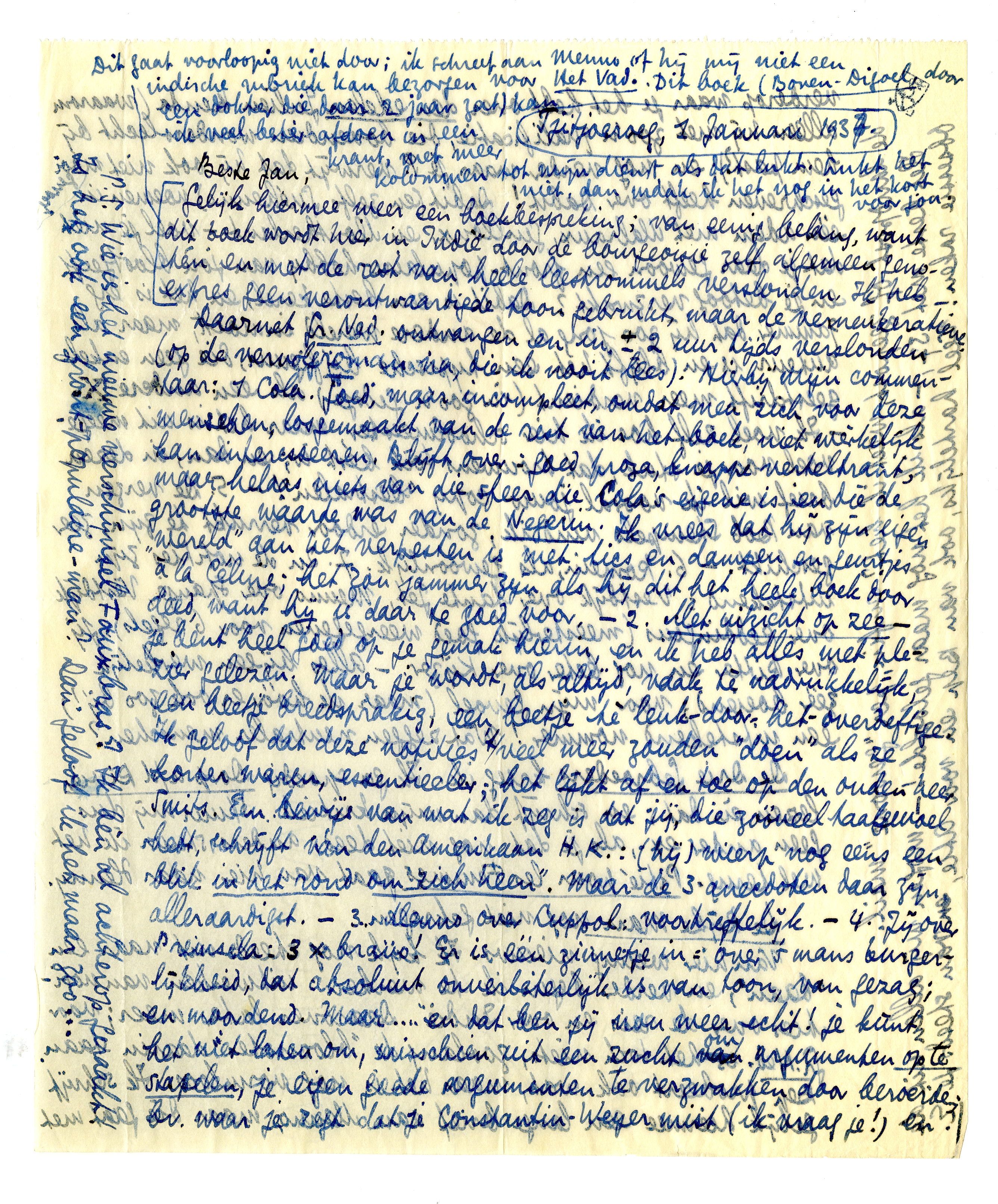 Daarnet Gr. Ned.4425 ontvangen en in ± 2 uur tijds verslonden (op de vervolgroman na, die ik nooit lees). Hierbij mijn commentaar: 1. Cola. Goed; maar incompleet, omdat men zich voor deze menschen, losgemaakt van de rest van het boek, niet werkelijk kan interesseeren, blijft over: goed proza, knappe verteltrant, maar helaas niets van die sfeer die Cola's eigene is en die de grootste waarde was van de Negerin. Ik vrees dat hij zijn eigen ‘wereld’ aan het verpesten is met tics en dampen en geurtjes à la Céline; het zou jammer zijn als hij dit het heele boek door deed, want hij is daar te goed voor. - 2. Met uitzicht op zee - je bent heel goed op je gemak hierin, en ik heb alles met plezier gelezen. Maar je wordt, als altijd, vaak tè nadrukkelijk, een beetje breedsprakig, een beetje tè leuk-door-het-overdeftige. Ik geloof dat deze notities 't veel meer zouden ‘doen’ als ze korter waren, essentieeier; het lijkt af en toe op den ouden heer Smits. Een bewijs van wat ik zeg is dat jij, die zóóveel taalgevoel hebt, schrijft van den Amerikaan H.K.: (hij) wierp nog ééns een blik in het rond om zich heen. Maar de 3 anecdoten daar zijn alleraardigst. - 3. Menno over Luppol: voortreffelijk. - 4. Jij over Premsela: 3 × bravo! Er is één zinnetje in: over 's mans burgerlijkheid, dat absoluut onverbeterlijk is van toon, van gezag; en moordend. Maar... en dat ben jij nou weer echt! je kùnt het niet laten om, misschien uit een zucht om argumenten op te stapelen, je eigen goede argumenten te verzwakken door beroerde; bv. waar je zegt dat je Constantin-Weyer mist (ik vraag je!) en verderop waar je het hebt over den edelen Julien Benda (waarom alleen hij met zoo'n qualificatie, die bovendien wonderslecht bij hem past?); en nog verder waar je P. verwijt dat hij ook niet mooi genoeg geschreven heeft over Dabit!4426 Dabit (en zelfs Guéhenno noemen in één adem met Malraux, Guilloux, en Montherlant - voel je niet dat je daar gewoon een front populaire-hobby van jou blootgeeft en je betoog verzwakt? Dabit is een beste kerel, en het is erg jammer dat hij zoo jong, al de andere wereld in moest, maar als auteur is en blijft het een typische bijfiguur, die geen enkele geestdrift meer verdient (in zoo'n gidsje) als een andere X. - Ik voel zelf hoe ik hier schoolmeester, maar het is uit meegevoel voor je stuk, dat trouwens tòch best is; en dan, in dezen brief wil ik vooral jouw copy ‘bestralen’! - 5. De verzen van Bob Stempels vind ik, zonder erdoor verrukt te zijn, zeer geschikt. - 6. Romein, als gewoonlijk. 7. In de notities zijn uitstekend: Vestdijk over tante Jet, Menno over Spanje, Vestdijk over Reddingius (meesterlijk goed weergegeven voor 6 regels), jij over Ritter en nog beter over Kijzer. - Alles bijeen werkelijk zéér boeiend; voor mijn gevoel (maar ik hóór er ook zoo bij!) een uitstekend nommer! Wat zeggen neutraler menschen?
