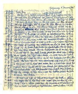 We hebben gisteren dan de fuif gehad, goddank zonder er veel van te merken hier, maar daardoor was het postkantoortje dicht, zoodat dit er nu bij kan. Vanmorgen kwam je brief, die waarin je van het bezoek aan Maastricht vertelt. Arme Sander. - Ik heb gisteren den heelen dag doorgepend aan mijn reisnotities die, ondanks alle schrappen, serreeren, enz., veel ‘rijker’ blijken te zijn dan ik dacht, zoodat ze niet 25 blzn. zullen worden, vrees ik, maar minstens 35. En vanmorgen ben ik zoowaar begonnen aan een novelle in verzen, d.w.z. aan een gedicht in beelden, paragrafen, etc., dat de draai neemt van een novelle. Het worden, als het mij lukt, 53 losse stukjes, sommige (de langste) van 16 regels (4 kwatrijnen), de kortste van 4 (één kwatrijn). Als het goed wordt stuur ik het je voor Ursa Minor.4439 Tusschen haakjes: kan je mij van deze collectie niet een present-ex. bezorgen? Ik ben zelf zeer benieuwd wat er van dat gedicht wordt; bedenk dat ik in geen jàren een versregel heb geschreven (kon of wou schrijven) en dat ik vanmorgen met betrekkelijk weinig moeite opeens 11 kwatrijnen schreef. Het lijkt wel Henny! Maar God weet hoe rot het nog wordt. Als het gedrukt wordt, ben ik absoluut gesteld op een aparte blzij voor ieder stukje, ook voor de losstaande kwatrijnen, zoodat het een boekje wordt van ± 60 blzn.