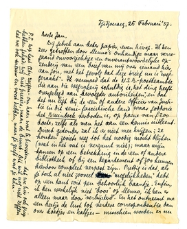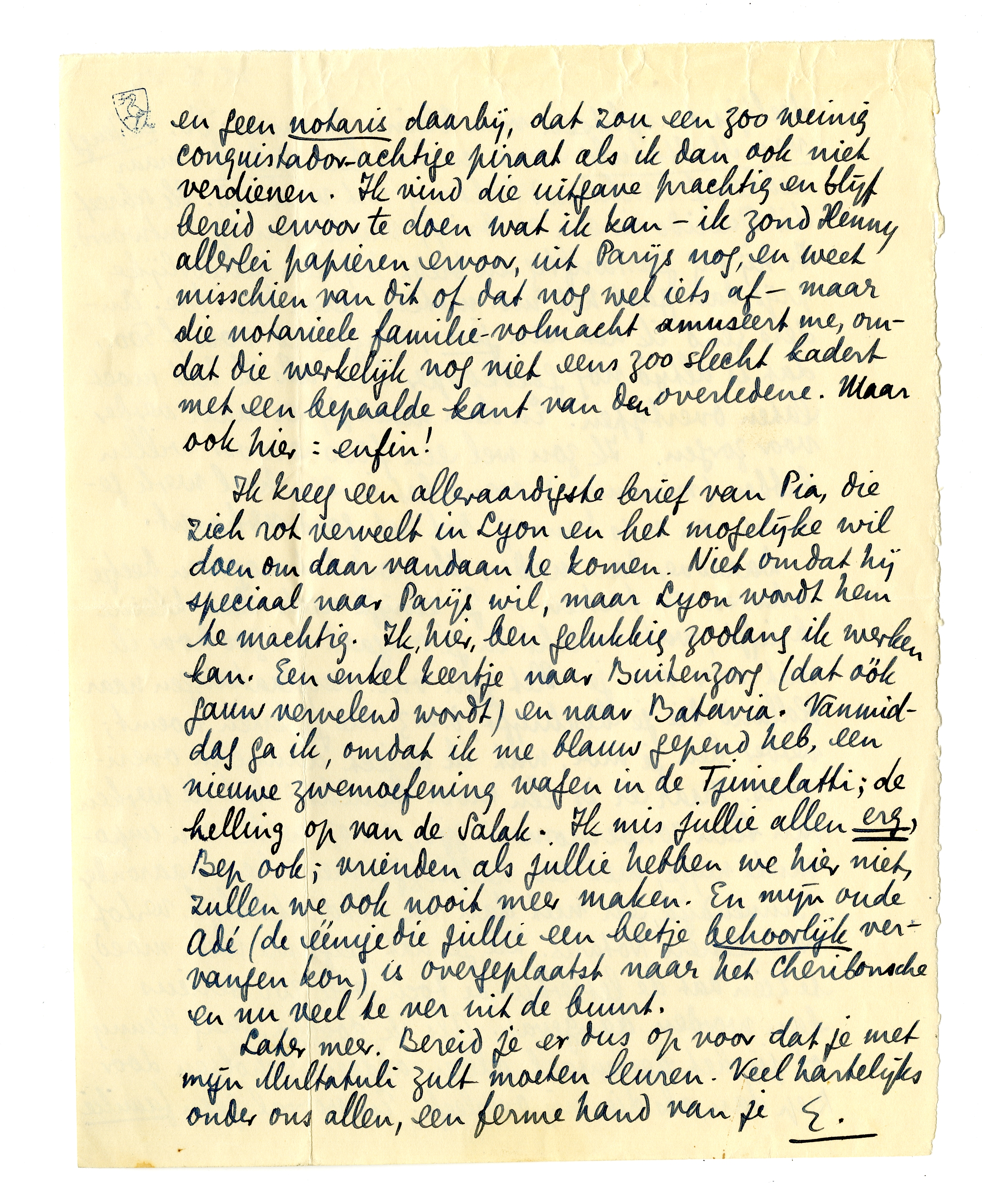Ik kreeg een alleraardigste brief van Pia, die zich rot verveelt in Lyon en het mogelijke wil doen om daar vandaan te komen. Niet omdat hij speciaal naar Parijs wil, maar Lyon wordt hem te machtig. Ik, hier, ben gelukkig zoolang ik werken kan. Een enkel keertje naar Buitenzorg (dat óók gauw vervelend wordt) en naar Batavia. Vanmiddag ga ik, omdat ik me blauw gepend heb, een nieuwe zwemoefening wagen in de Tjimelatti; de helling op van de Salak. Ik mis jullie allen erg,4474 Bep ook; vrienden als jullie hebben we hier niet, zullen we ook nooit meer maken. En mijn oude Adé (de éénige die jullie een beetje behoorlijk vervangen kon) is overgeplaatst naar het Cheribonsche en nu veel te ver uit de buurt.