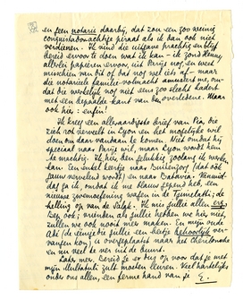 Daarover dan nader. Ik moet het nog een beetje schaven en toetsen. - Je schrijft niets dan kleine briefjes, wat er echt in je omgaat en zoo hoor ik niet meer van je. Het zijn vnl. verplaatsingen naar Holland dieje beschrijft, d.w.z. dieje even noemt; verder ben je moe, wat ik direct aanneem overigens. Maar er is één mooi bericht: dat de werken van Slau ‘ondernomen’ zijn, en op welk een imposante wijze, met een halfdozijn menschen waaronder Binnendijk, en niet dan na uitdrukkelijk verlof van eenen Notaris.4473 Zie je, dat geeft me weer moed, te zien dat de letterkunde toch ook zoo serieus kan worden aangevat. Als ik doodga, mag Henny of jij het heelemaal alleen afdoen, geholpen door Bep dan, als die mij overleeft. En vooral geen familie en geen notaris daarbij, dat zou een zoo weinig conquistadorachtige piraat als ik dan ook niet verdienen. Ik vind die uitgave prachtig en blijf bereid ervoor te doen wat ik kan - ik zond Henny allerlei papieren ervoor, uit Parijs nog, en weet misschien van dit of dat nog wel iets af - maar die notarieele familie-volmacht amuseert me, omdat die werkelijk nog niet eens zoo slecht kadert met een bepaalde kant van den overledene. Maar ook hier: enfin!